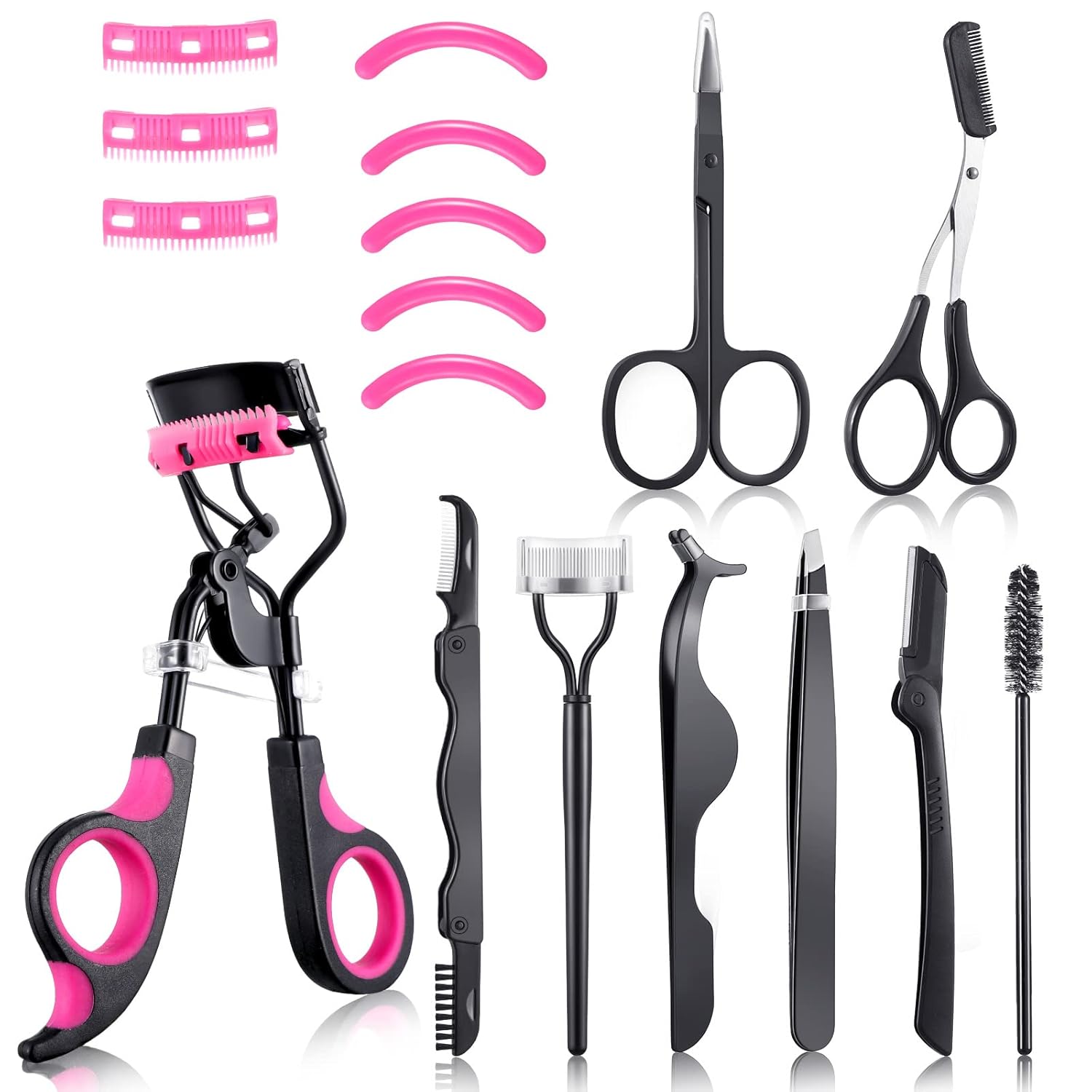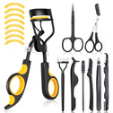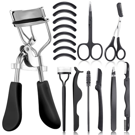 - Nice Eyelash Curler Combination Set: the eyelash curlers kit includes 1 lash curler, 1 pair of scissors, 1 pair of scissors with comb, 1 pair of eyelash extension tweezers, 1 false eyelashes applicator, 1 retractable eyebrow trimmer, 1 eyebrow brush, 1 eyebrow trimmer, 1 foldable steel comb, 5 silicone refills pads and 3 brush refills, the nice combination can meet your daily needs