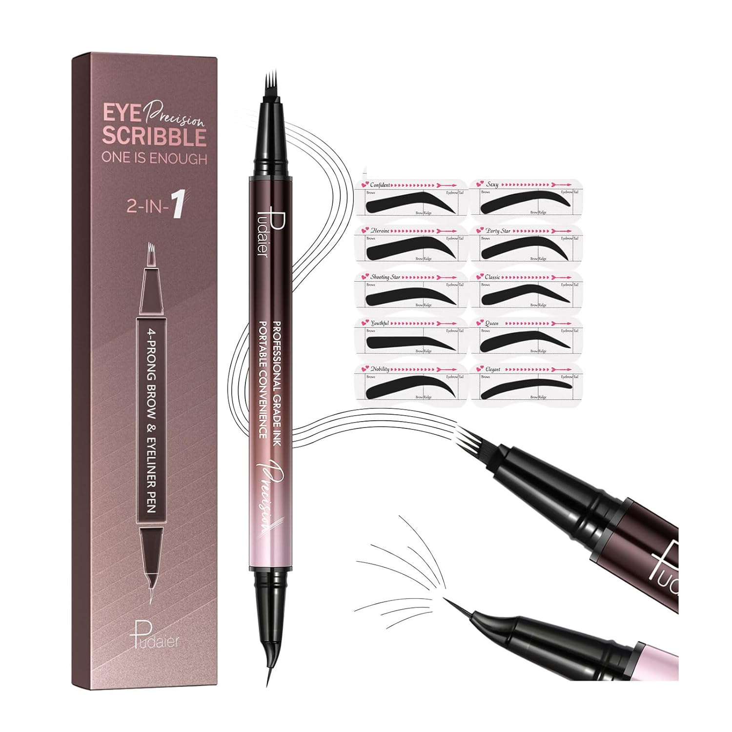 2-in-1 Curved Eyebrow Pen and Eyeliner with 10Pcs Brow Stencils, Microblading Eyebrow Pencil with 4 Fork-Tip and Curved Precise Tip, Waterproof and Long Lasting Eyebrow Pencils for Women, Soft Brown