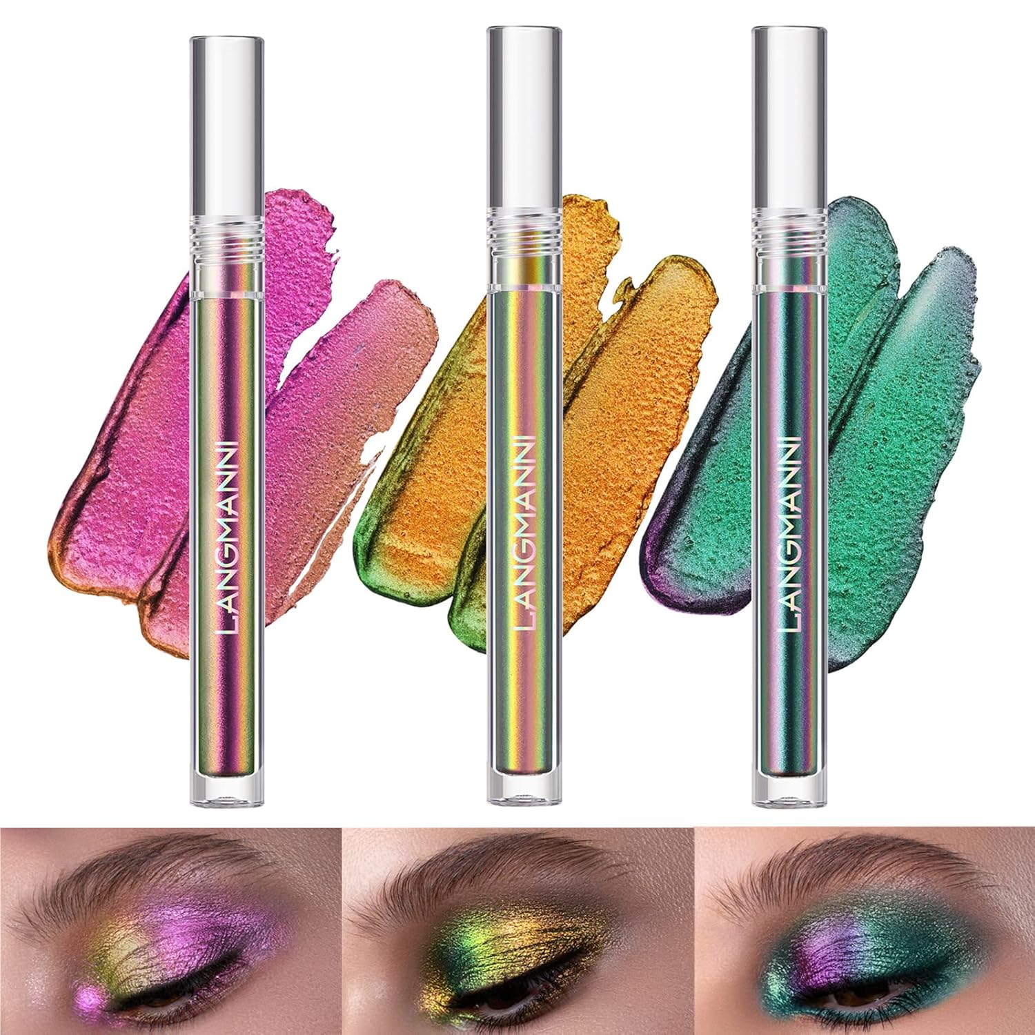3 Colors Metallic Liquid Chameleon Eyeshadow, Multi-Dimensional Eye Looks, Long-lasting Holographic Glitter Multichrome Eyeshadows Makeup (#Peacock+Wonder+Ember)