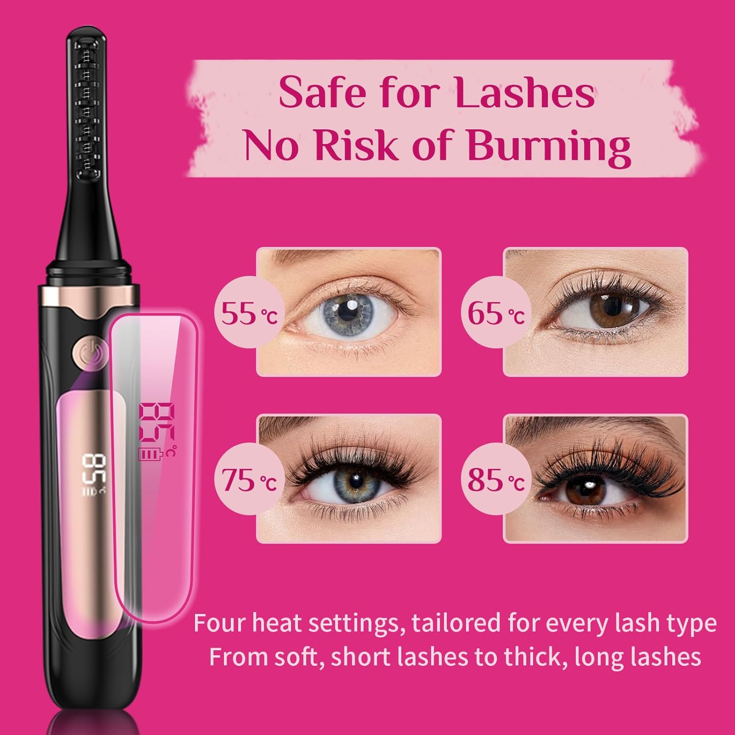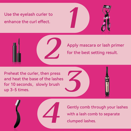 - FAST HEATING & 24-HOUR LONG-LASTING CURLS - Our heated eyelash curler features 4 adjustable heat settings to suit different lash types. Heats up in just 10 seconds, making your morning routine effortless. Advanced heat technology locks in curls for up to 24 hours, creating a lifted, natural look without crimping or pinching. Get salon-quality curls at home!