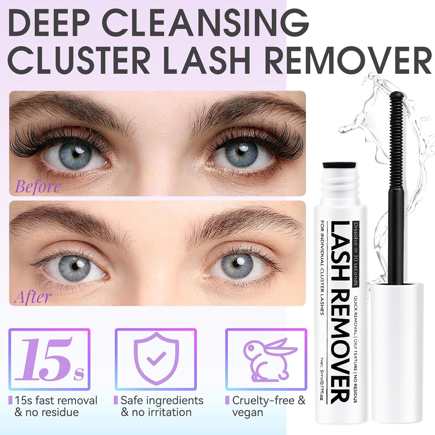 • Deep Cleansing Lash Remover: With a spiral brush head, the oil-based lash cluster remover goes deep into the root of the lashes to remove the adhesive. 15 seconds is all it takes to dissolve the adhesive for quick, residue-free removal