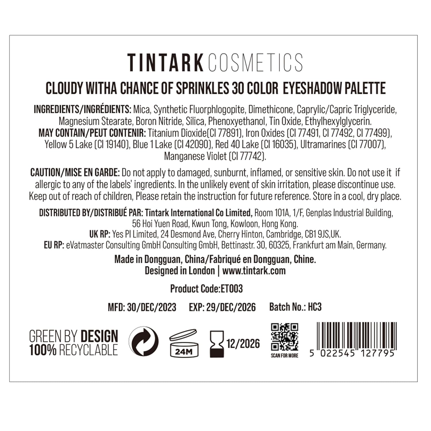 “Cloudy with a Chance of Sprinkles” is a super fun and colourful eyeshadow palette inspired by candy and all things sweet! Explore the wonders of the rainbow with this selection of 30 highly pigmented eyeshadows in matte, metallic, glitter and sparkle.
