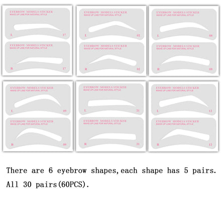 • The package includes 6 Styles available(5 pairs per eyebrow) ,30 pairs(60 PCS) eyebrow stencils.
