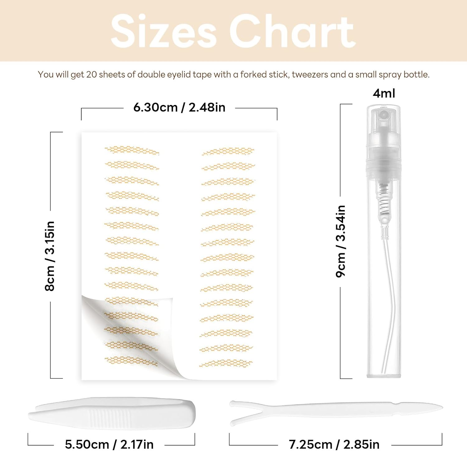 • Double Eyelid Tape Set: You will get 20 sheets of double eyelid tape with a forked stick, tweezers and a small spray bottle to help you easily create a natural looking double eyelid effect.