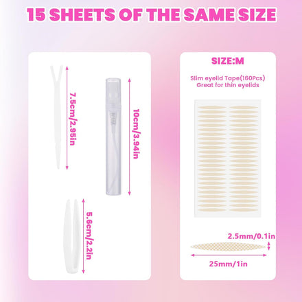 Product name: 720pcs double eyelid stickers (including tweezers + Y fork + spray bottle) Product color: skin color Product material: double eyelid stickers: PE film, fiber, fork tweezers: PP, spray bottle: PP, metal Product size: bottle length: 10cm/3.94inch Tweezers length: 5.6cm/2.2inch Y fork length: 7.5cm/2.95inch Olive type: width 2.5mm/0.1inch Packing list: 720pcs double eyelid stickers (including tweezers + Y fork + spray bottle)
