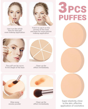 Powder Puffs: 3Pcs powder puffs, sufficient quantity, can be cut at will to meet your different needs