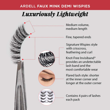 - Embrace Soft and Flirty Faux Lashes: Achieve a whispery-soft look with this Ardell Faux Mink Demi Wispies. Enjoy high-impact elegance with effortless curls for medium-length definition, creating naturally gorgeous and irresistibly alluring eyes.