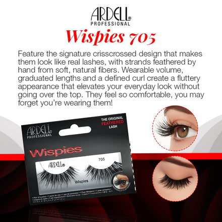 Ardell Wispies 705 feature the signature crisscrossed design that makes them look like real lashes, with strands feathered by hand from soft, natural fibers. Wearable volume, graduated lengths and a defined curl create a fluttery appearance that elevates your everyday look without going over the top. They feel so comfortable, you may forget you’re wearing them!