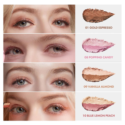 - 2-TONE EYE SHADOW FOR EFFORTLESS GLAM. Transform your eyes in seconds with ELROEL Blanc Double Shadow Stick! Available in #01 Gold-Espresso, #08 Popping-Candy, #09 Vanilla-Almond, and #10 Blue Lemon-Peach, our eyeshadow sticks combine dazzling glitter with soft matte or shimmer for a perfectly blended look that’s both playful and polished.