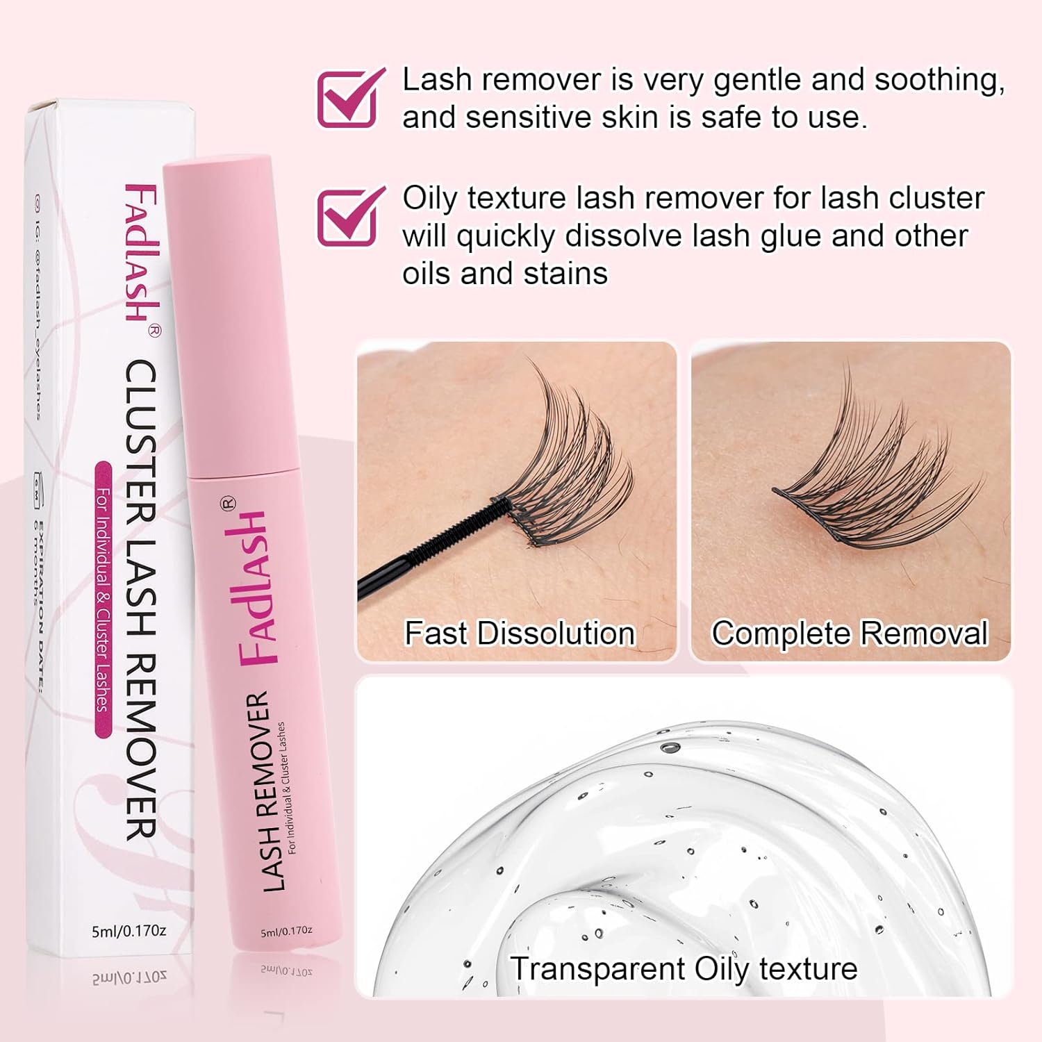 - ✺Dissolve Quickly: FADLASH lash glue remover for clusters are designed with a spiral brush head that can penetrate deep into the root of the cluster lashes, oily texture lash remover for lash cluster will quickly dissolve lash glue and other oils and stains wait for the lash cluster glue dissolve entirely after several minutes, gently wipe off and remove the cluster lashes with a cotton pad.