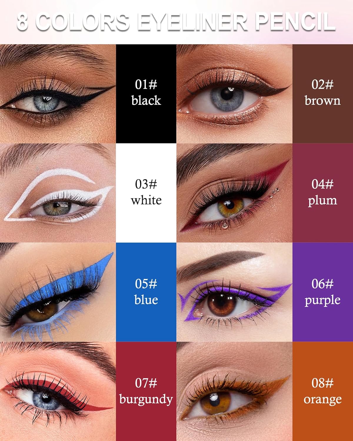 Black/Brown/White/Plum/Blue/Purple/Burgundy/Orange Matte Liquid Quick-drying Eyeliner, Waterproof Smudge-proof Long Lasting Rainbow Eye liner Pencil, delineador de ojos contra el agua Makeup for Bold Stunning Looks, Gift for Women Girls Description: Net Content: 0.8g/pc Colors: 8 Colors Optional Package contains: 1* Matte Liquid Eyeliner Feature: 1. A highly pigmented matte formula in 8 vibrant colors allows for quick and versatile eye makeup looks. 2.The quick-drying, long-lasting formula resists smudging and fading for all-day wear with sharp precision. 3. Its user-friendly precision tip ensures easy application for all skill levels and removes effortlessly with makeup remover. 4. Ideal for travel, compact pen format that fits in all handbags. Warm Tips: 1. Store in a cool, dry place. 2. This product is for external use only. 3. In case of signs of skin irritation or rash, stop application. 4.To ensure the lifespan of the product, please promptly close the pen cap to prevent drying out.