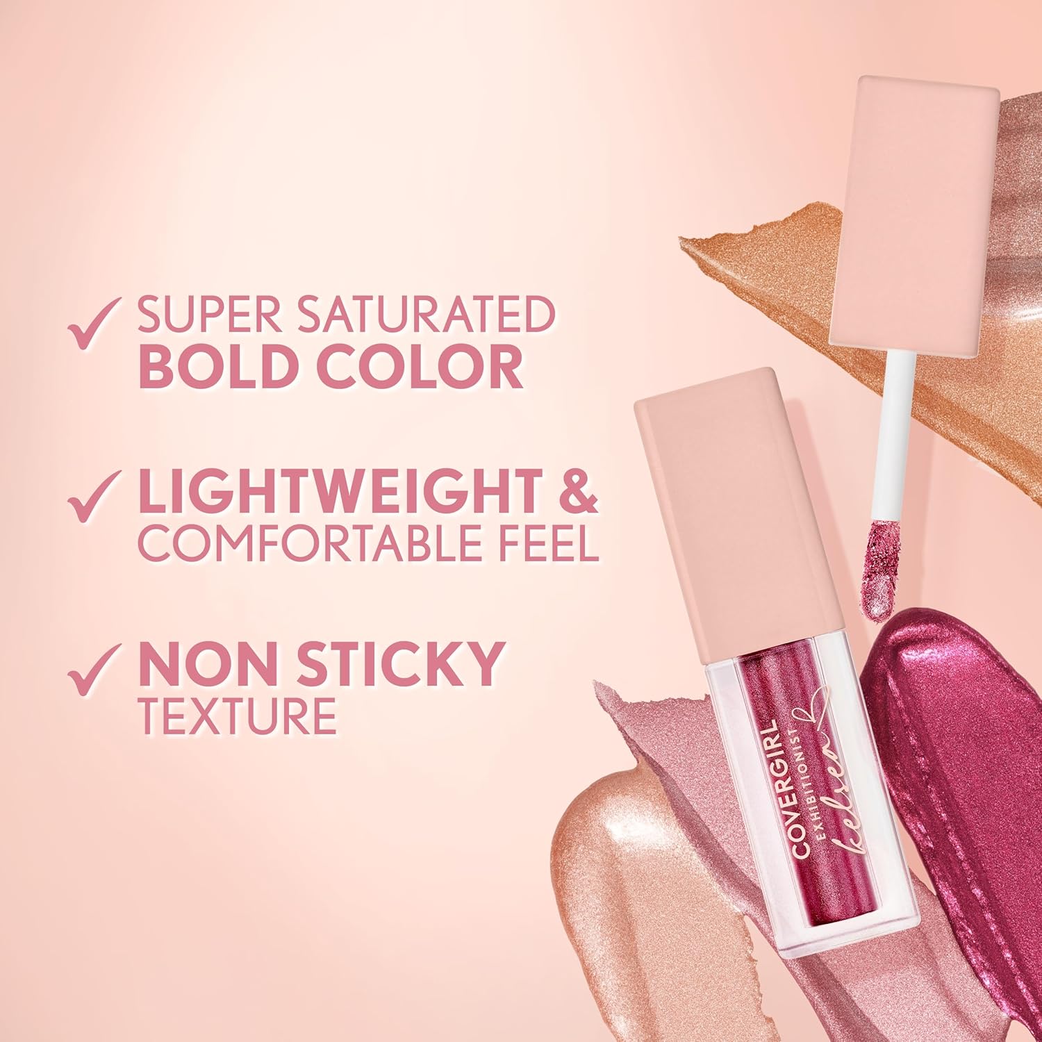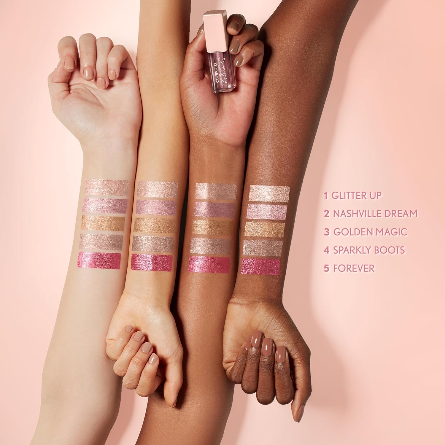 The Exhibitionist by Kelsea Ballerini Liquid Glitter Eyeshadows are 5 rose gold eyeshadow shades, personally created by Kelsea and inspired by her favorite holiday looks. This highly pigmented, multi-dimensional metallic eyeshadow has a glittery finish and lasts all day. Application is easy and effortless thanks to one-swipe color payoff. Glide it on and build it up to highlight eyes in time for the holidays.