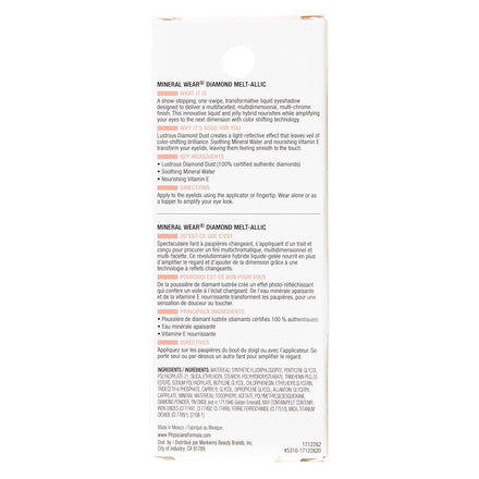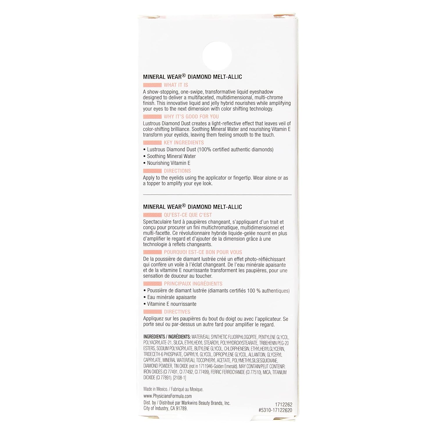 One swipe is all that’s needed for some show-stopping eyeshadow drama. Introducing Mineral Wear Diamond Melt-allic, a multifaceted, multidimensional and transformative liquid eyeshadow. The unparalleled three tone multi-chrome finish will take your eyes to the next dimension with color shifting technology and the addition of genuine Lustrous Diamond Dust. The innovative liquid and jelly hybrid amps up the eyes while nourishing the eye area with a soothing blend of Mineral Water and Vitamin E. About Physicians Formula: It all started in 1937, when leading allergist Dr. Frank Crandall created Physicians Formula as an expression of love for his wife Edith, who suffered from lupus and longed for makeup that wouldn’t aggravate her sensitive skin. Since then, we have continued Dr. Crandall’s concept of “healthy beauty.” To this day, every one of our products is carefully crafted and tested to meet our strict requirements: they are hypoallergenic, safe for sensitive skin and eyes, and created without any of the 150+ known harsh ingredients found in other personal care items.