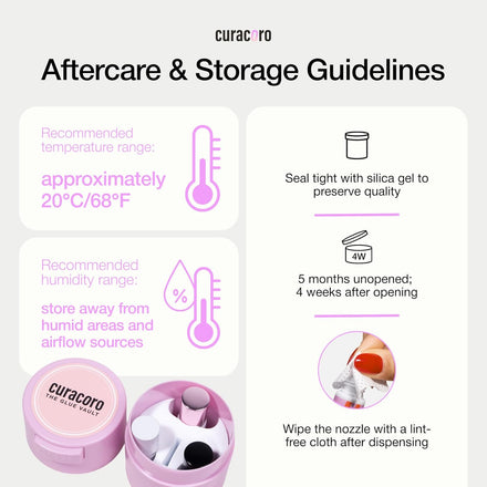• STORAGE & SHELF LIFE: Keep the adhesive in a cool, dry, and dark place away from light, humidity, and airflow. Always store upright in an airtight container with silica gel to prevent moisture and clogging. Unopened, it lasts up to 5 months; once opened, use within 4 weeks for best performance.