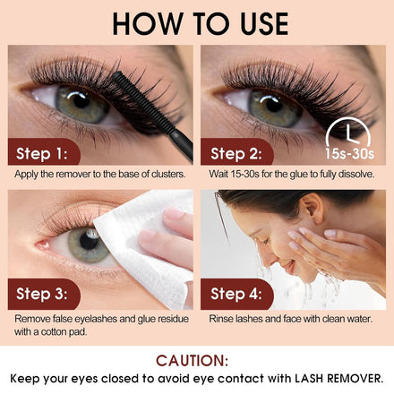 - QUICK REMOVAL: To remove lashes, simply apply the lash glue remover to the base of the cluster, wait 15-30s until eyelash glue and other oils and stains have dissolved, then gently remove lashes and residue.