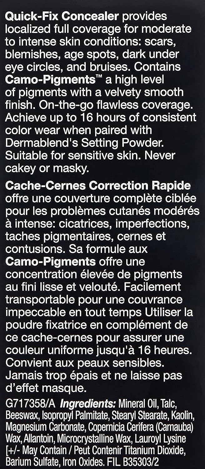 Quick Fix concealer can be used to cover a variety of skin concerns including dark under eye circles, scars, blemishes, dark spots, hyperpigmentation, and bruises.