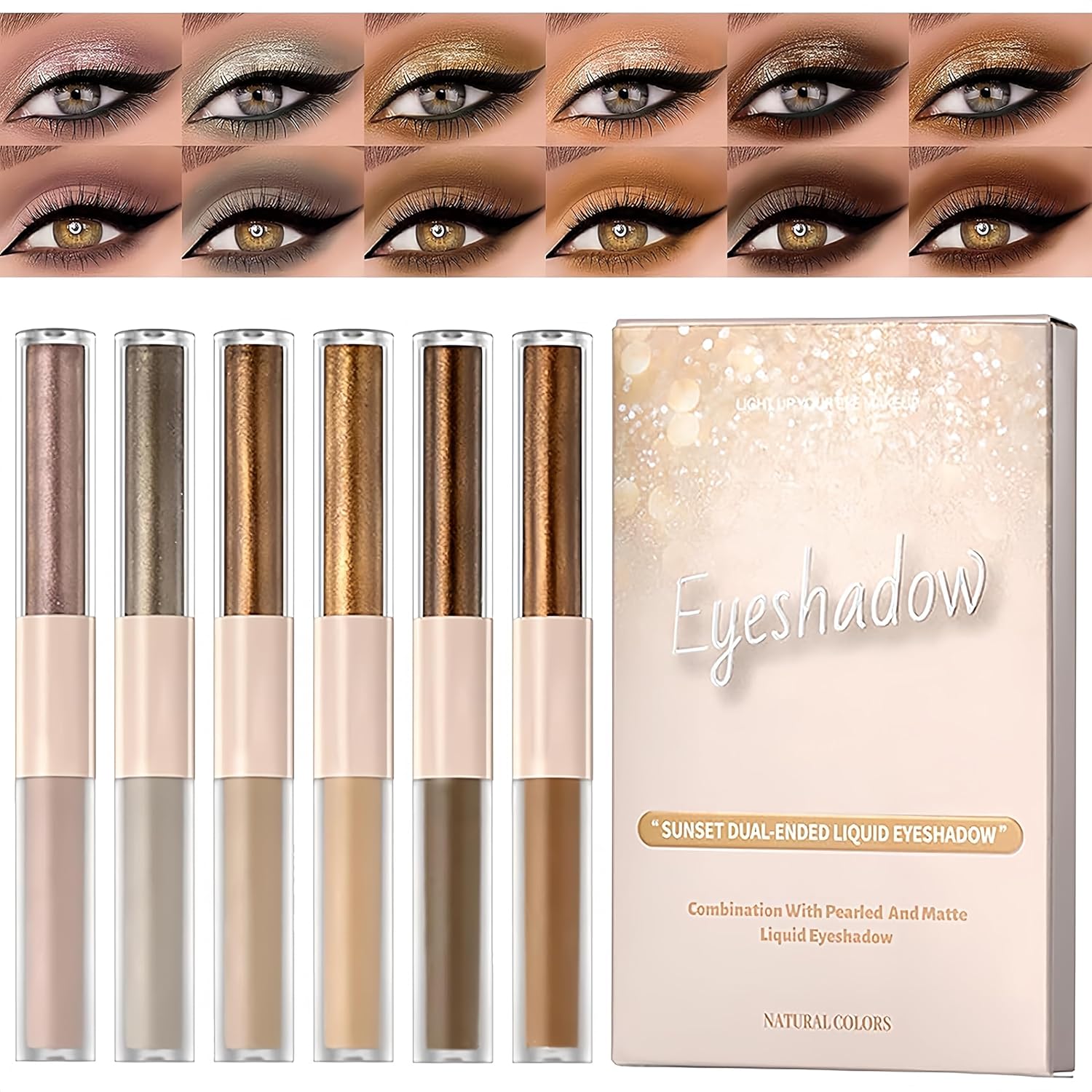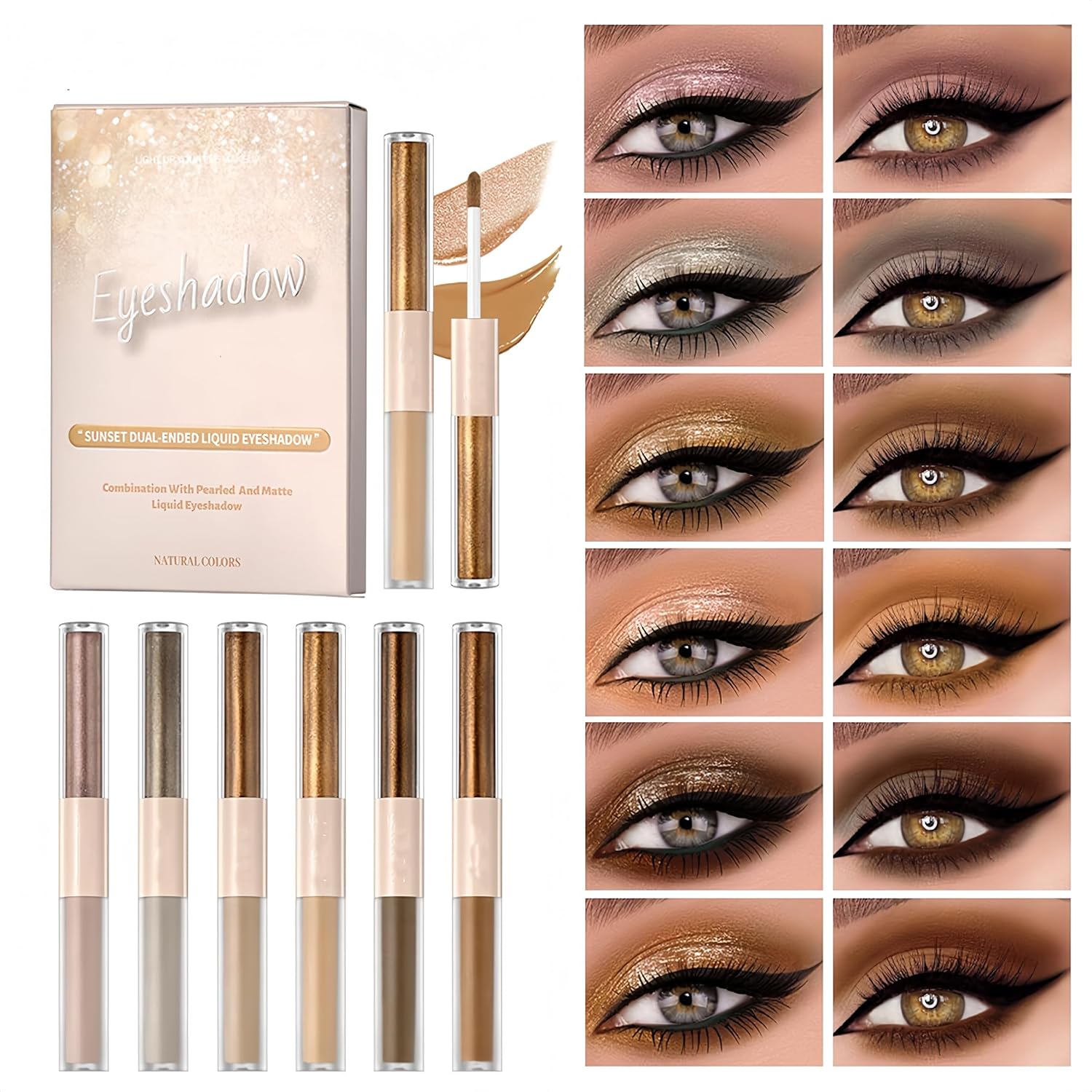 - đăNetural 6 Colors ShadesăThis liquid eyeshadow set comes 6 Colors, and is a great mix of beautiful nude and neutral colors. All of them makes a perfect natural look, and suit all skin tones, perfect for everyday use to look stunning.