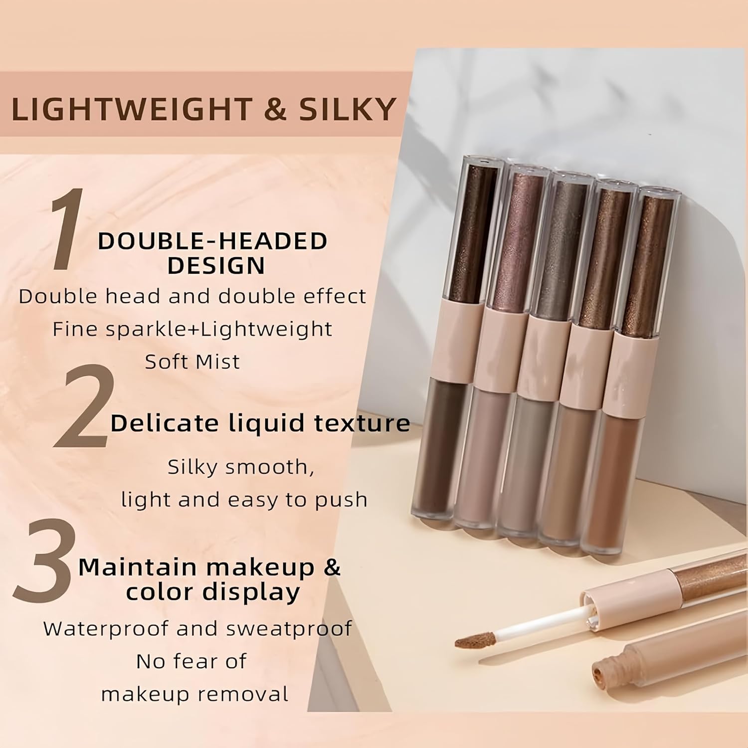 - đăWaterproof & Long-lastingăThe smudge-proof, quick-drying formula means you don't have to worry about shedding eye makeup after sweating. This liquid eyeshadow is not only waterproof and sweatproof but also maintains high-pigmentation eye makeup all day, regardless of humidity and hot weather.