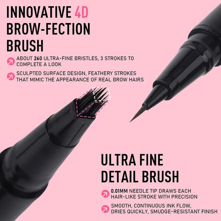 - 2 IN 1 BROW PEN -This innovative liquid eyebrow pen features a dual-ended design that combines two pro-grade applicators in one sleek tool. One end is equipped with a brow-fection square angled brush, perfect for creating natural-looking hair strokes and filling in sparse areas. The other end features a super-fine detail brush tip for defining edges, shaping arches, and adding micro-precision details—giving you total control over your brow style, from natural to bold.