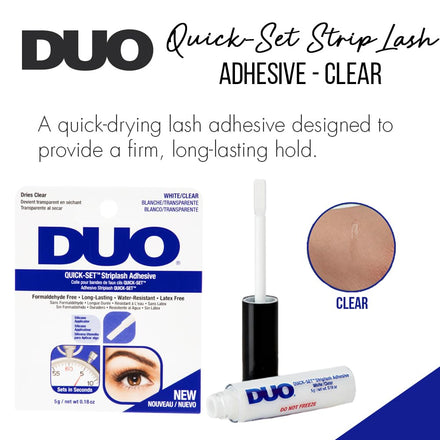 Duo Quick-Set Striplash Adhesive Clear is a quick-drying lash adhesive designed to provide a firm, long-lasting hold in seconds.