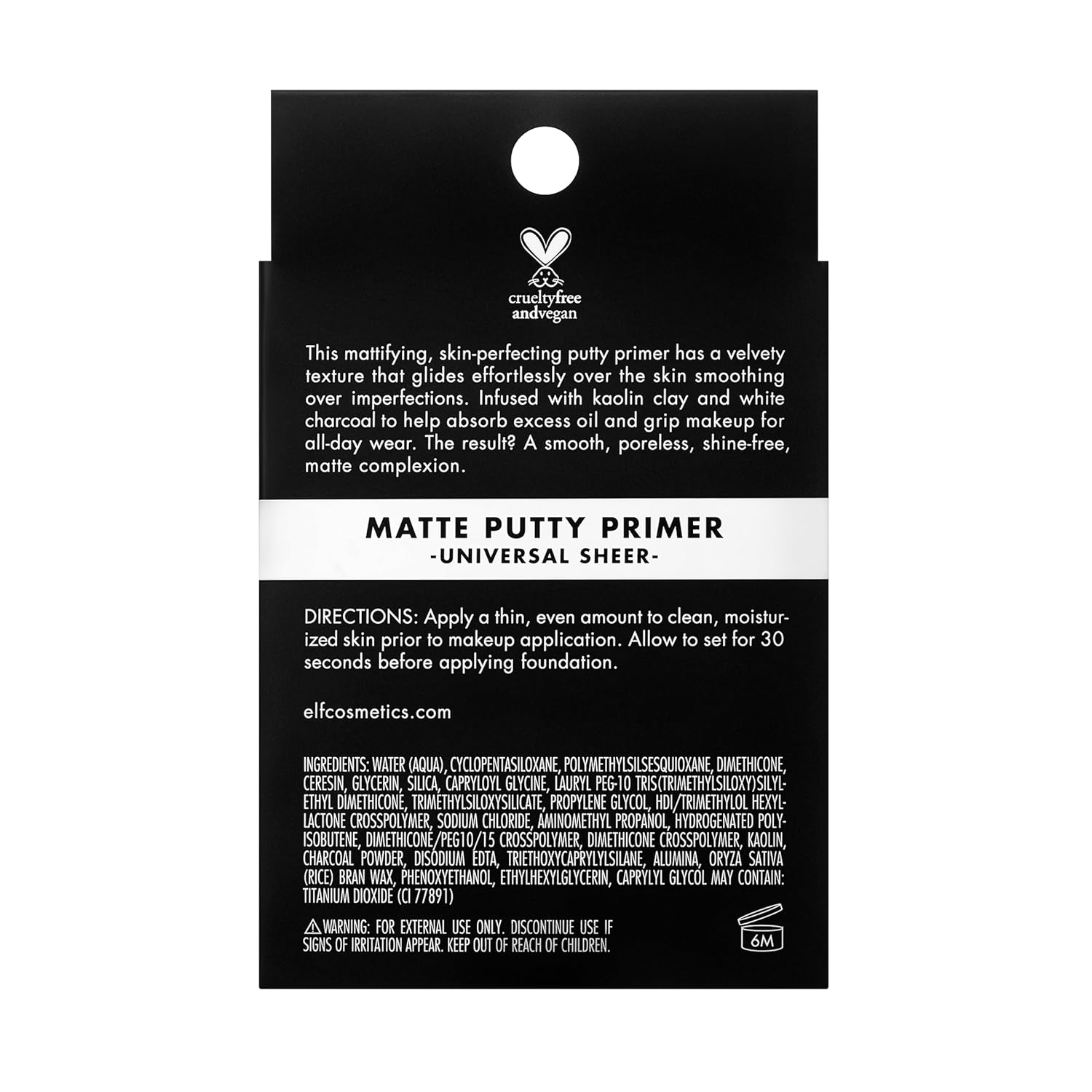 What it is: Our best-selling primer goes matte! This velvety, oil-free formula delivers a perfect matte finish. Why we love: This skin perfecting putty primer is infused with kaolin and white charcoal Absorb excess oil for a shine-free finish Velvety texture glides effortlessly over the skin, smoothing over imperfections for a poreless effect The ultimate grip on makeup Which Putty Primer is perfect for you? Matte Putty Primer – Perfect for those who want a shine-free matte complexion. Poreless Putty Primer- Perfect for those who want a poreless, flawless finish. Luminous Putty Primer – Perfect for those who want a radiant, glowing complexion. Pro Tip: Use the Putty Primer Applicator for easy and hygienic putty primer application. All e.l.f. products are made from skin-loving ingredients you want at good-for-you prices. All e.l.f. products are 100% vegan, cruelty-free, and leaping bunny certified. Because kindness is chic.