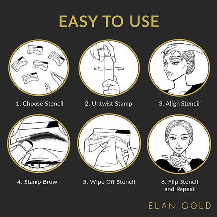 Effortless & Flawless Eyebrows in Minutes! If you want perfect eyebrows without the hassle, our eyebrow stamp and stencil kit is the perfect tool for you Goodly by Elan Gold Eyebrow Stamp Stencil Kit Includes: Medium Brown Eyebrow Stamp Five Brow Stencils Gold Eyebrow Tweezer Brow Spooly Brush Makeup Pouch HOW TO USE: Step 1 Choose the appropriate eyebrow stencil for your desired brow shape, align with your brows using the grid lines Step 2 Open stamp, dip and twist inside lid for more product Step 3 Stamp onto eyebrow, applying starting from the end of your eyebrow Step 4 Clean up any stray hairs with the included eyebrow tweezer