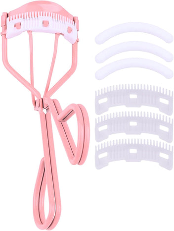 • What items are included in the colored box: 1 eyelash curler with comb, 3 pink replacement combs and 5 pink replacement pads.