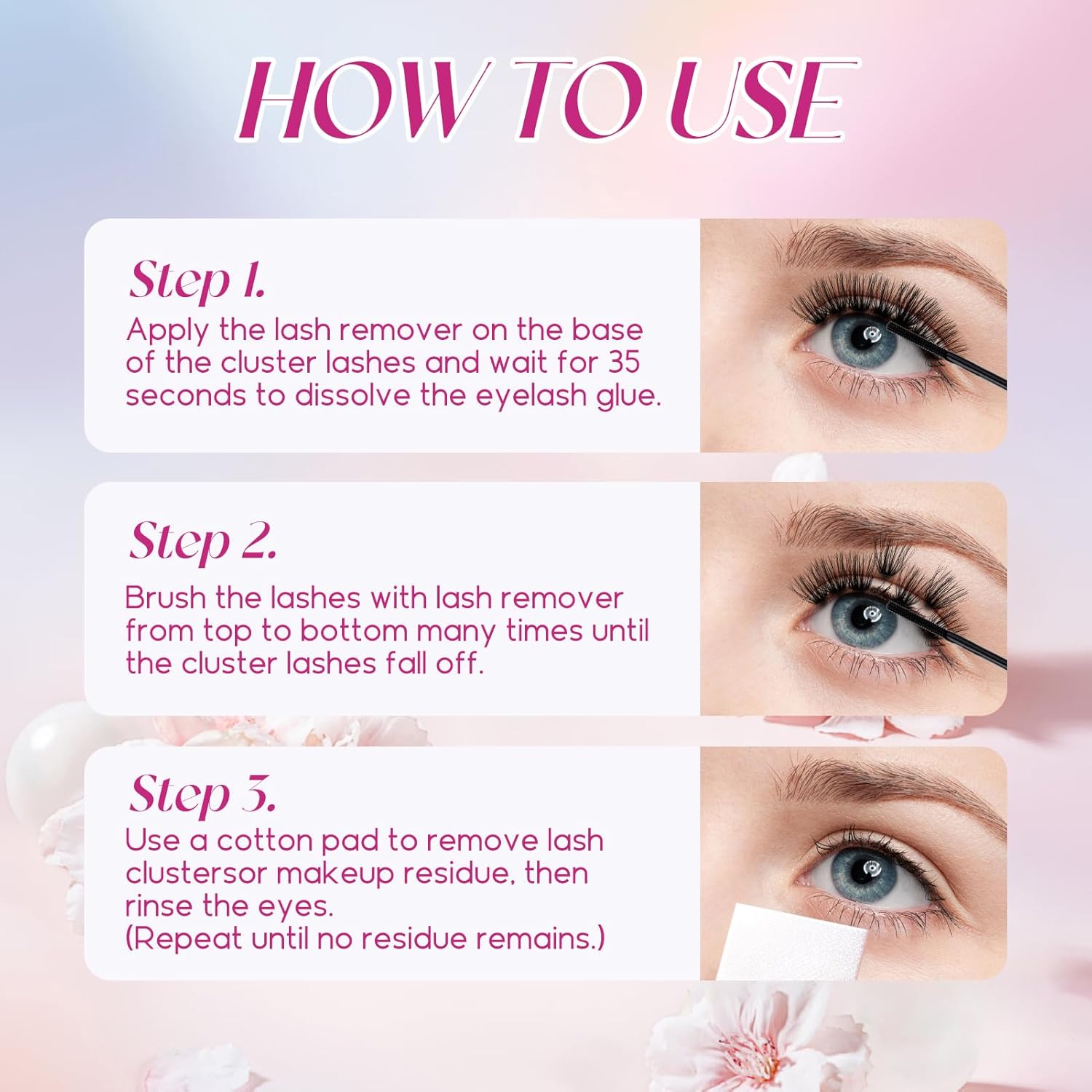 - Easy to Use: 1: Apply lash remover to the root of false lashes and wait 60 seconds for the lash glue to dissolve. 2: Brush lashes with lash remover several times from top to bottom until the clusters come off. 3: Remove the clusters with a cotton pad and rinse your eyes until there is no residue.