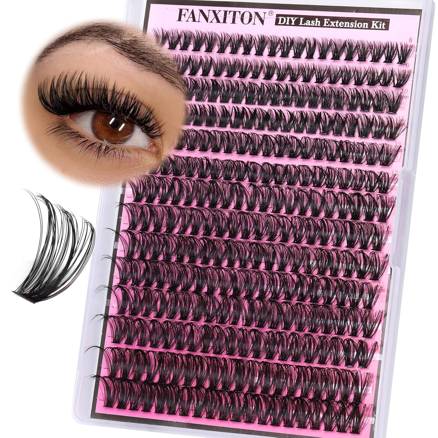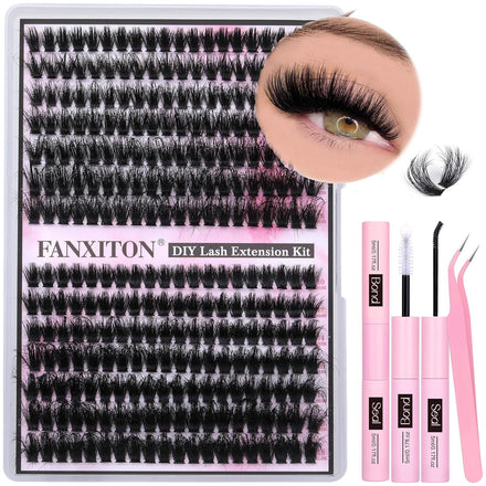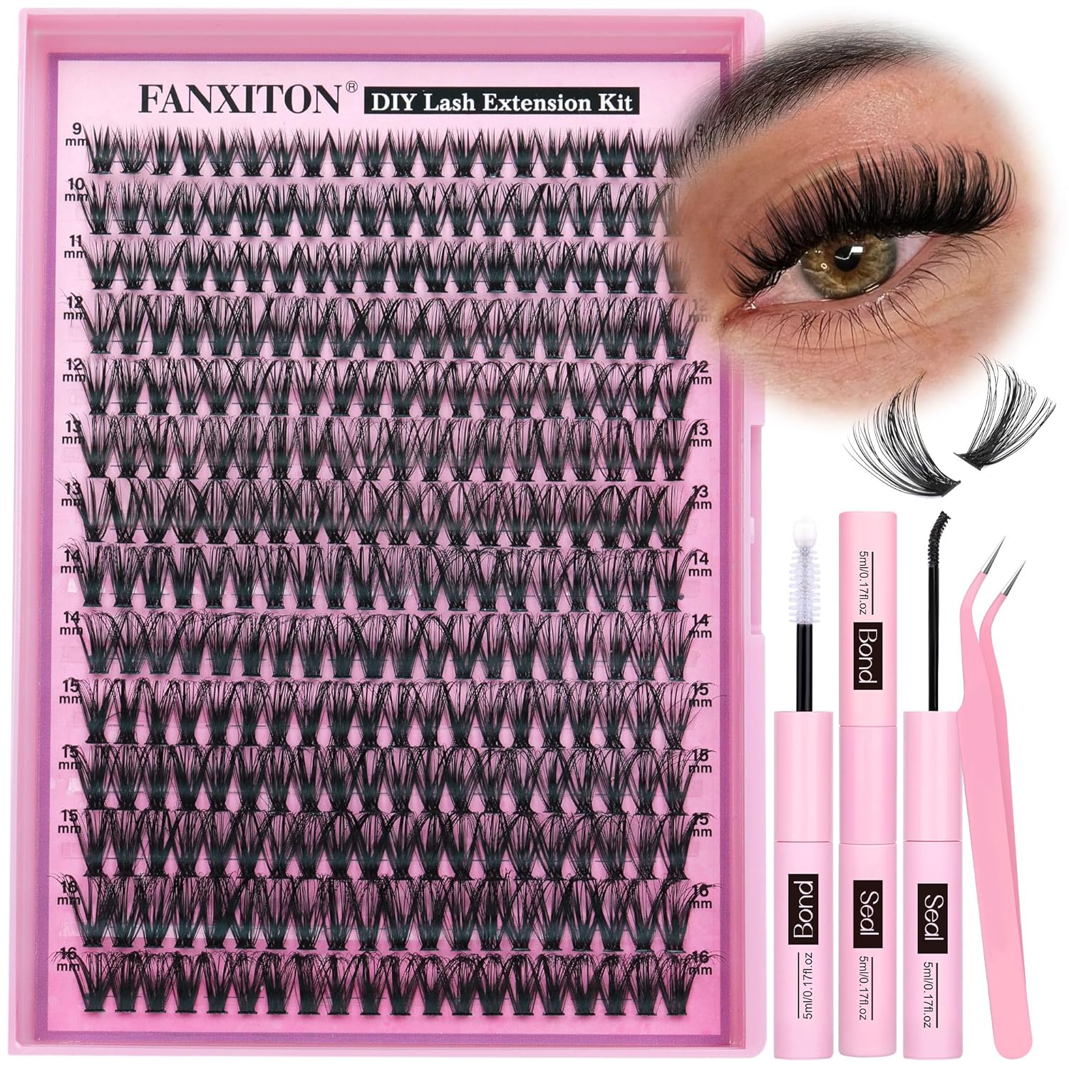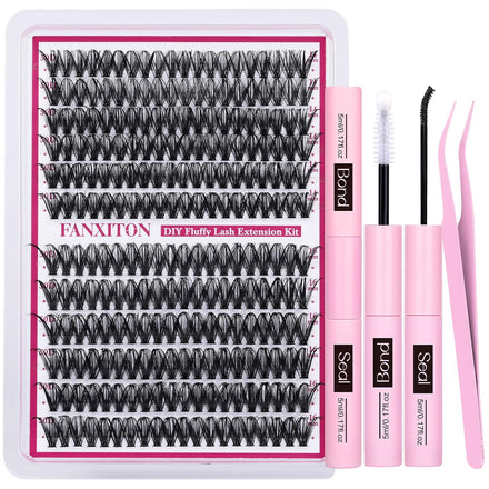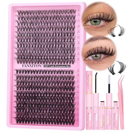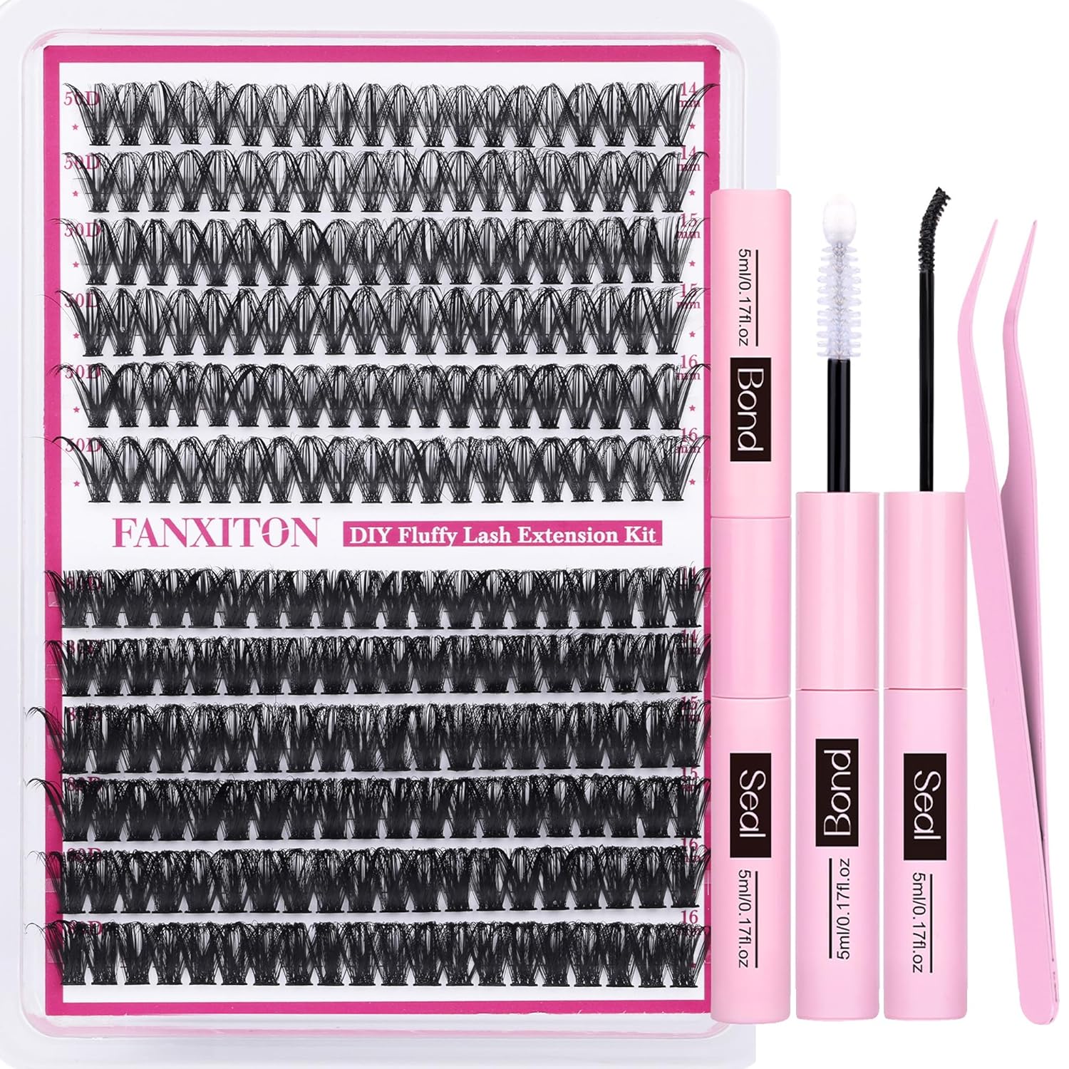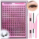 FANXITON DIY Lash Extension Kit Volume Lash Clusters 40D+50D D Curvature Individual Lashes Lash Clusters Kit Thick Eyelash Extension Kit 280 pcs Thin Band Cluster Lashes Lash Bond and Seal Tweezers