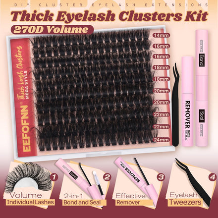 • All-In-One Professional Volume Eyelash Extension Kit: Get everything you need for diy mega lash extensions in our fluffy lash clusters kit. Thick eyelash clusters kit includes 270D volume individual lashes, long-lasting bond and seal lash glue, lash remover and tweezers.
