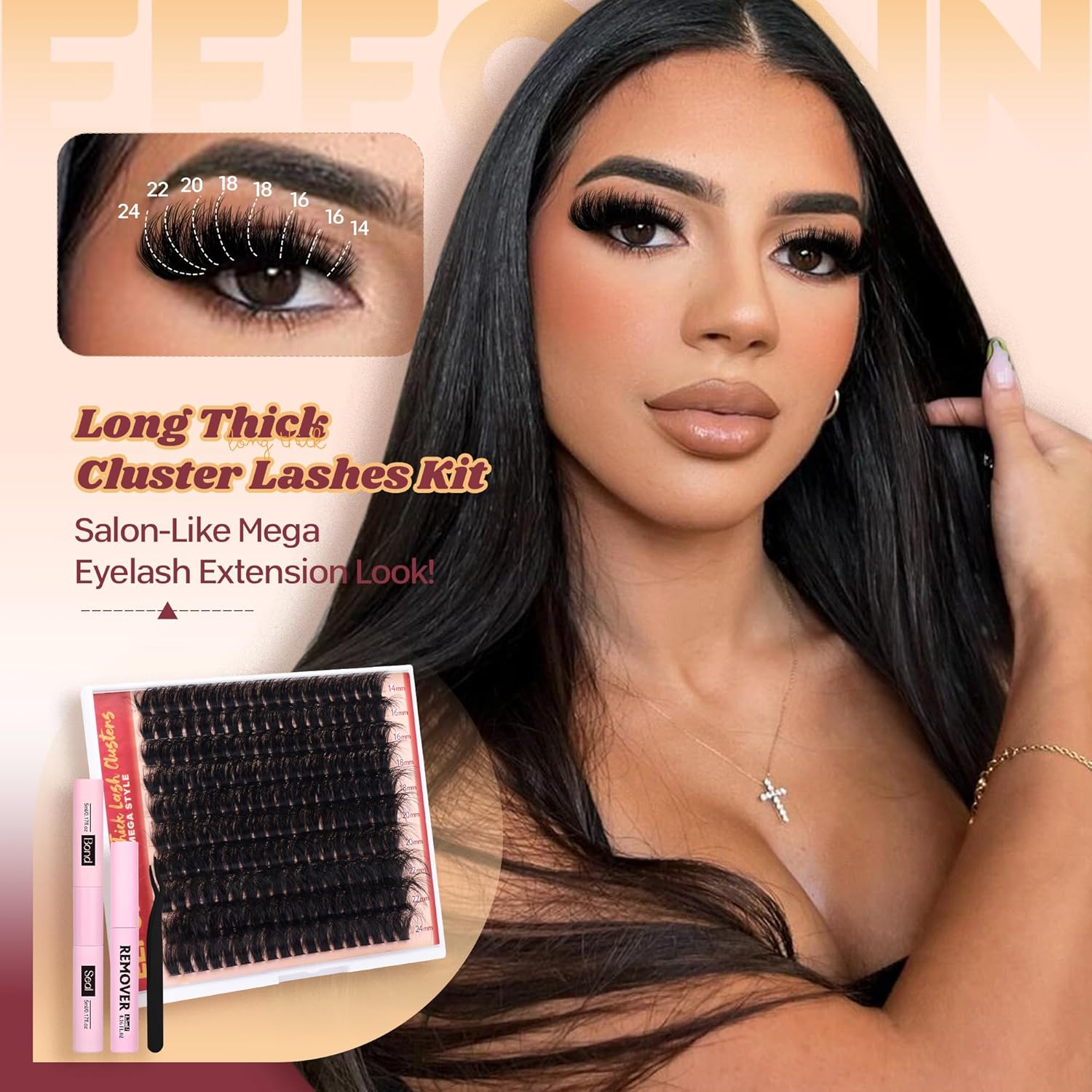Fluffy Lash Clusters Kit Dramatic 270D Cluster Eyelash Extensions Kit 14-24mm Long Eyelash Clusters Kit Thick Volume Individual Lashes Bond and Seal Remover Tweezers Mega Lash Extension Kit by Eefofnn