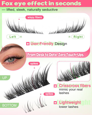 • Effortless Application with Soft Band: Featuring a thin yet soft lash cluster band, these spike lash allow you to complete one eye in just 4-6 easy placements, saving time while delivering full, fluttery volume. The waterproof design blends flawlessly with your natural lashes, letting you customize density for a subtle wispy or cute fox eye lash extension look.
