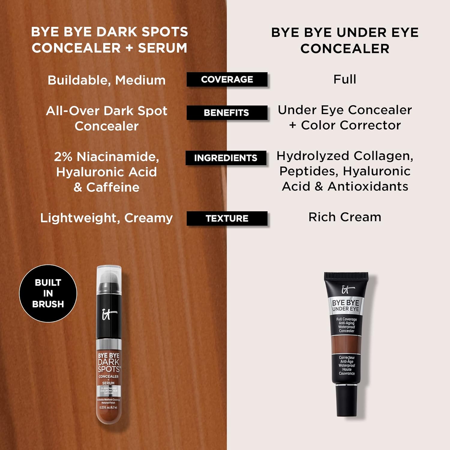 Bye Bye Dark Spots Concealer + Serum is a lightweight concealer that provides medium coverage and is clinically tested to fade dark spots after 12 weeks of daily use. Bye Bye Under Eye Concealer is a full-coverage color-correcting concealer.