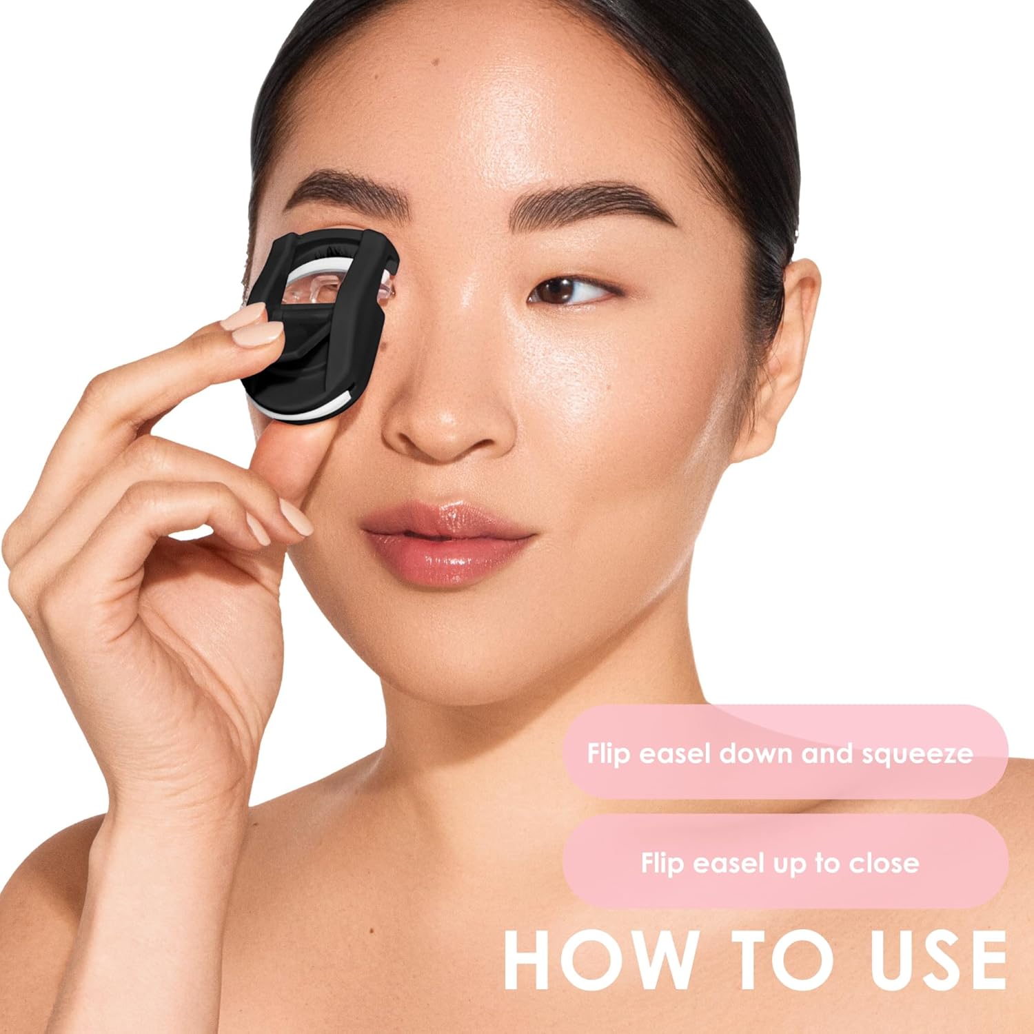 • CONVENIENT LASH TOOL - The travel lash curler holds a bonus replacement lash pad conveniently tucked inside. To use, flip the easel down and squeeze, then flip up to close. Use before mascara application. Plastic materiel is easy to clean!