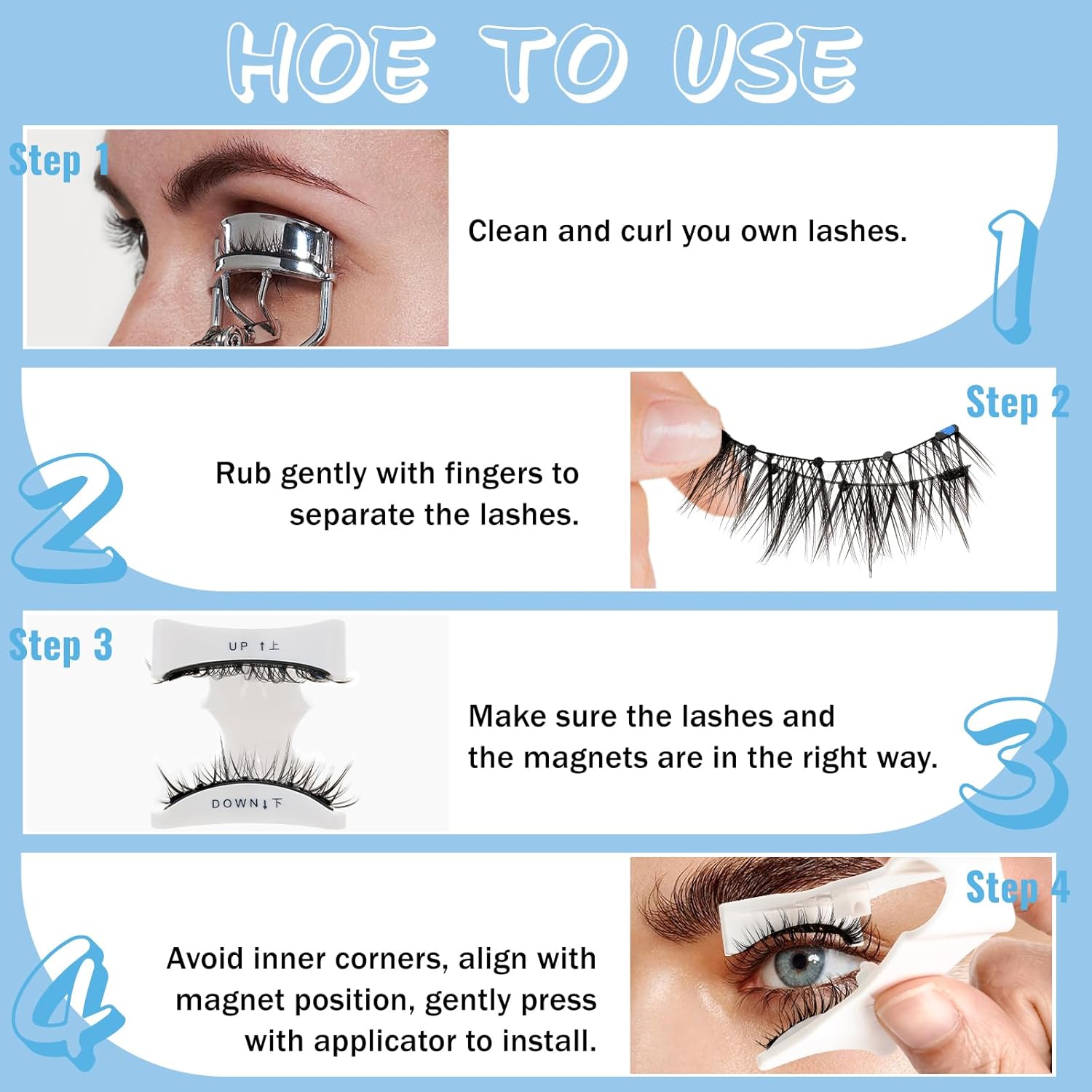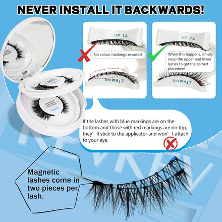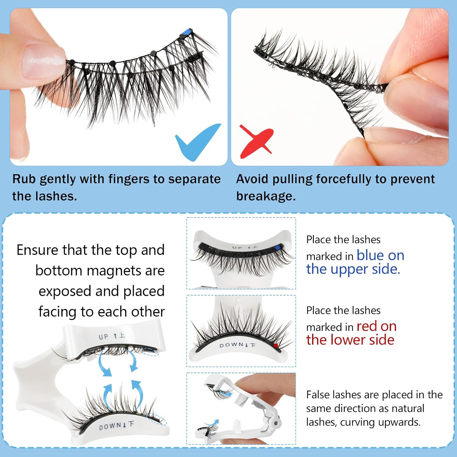 - How To Use: 1: Curl your natural eyelashes. 2: Separate the two lashes by gently twisting them in your hand. 3: Place the top and bottom lashes on the applicator. Note: Place the blue-marked lashes on the top side and the red-marked lashes on the bottom side. Make both the upper and lower magnetic lashes curved upwards in the same direction as your natural lashes are curved. 4: The top of the applicator is pressed tightly attached to the base of your natural lashes, press and close, the upper and lower lashes are sucked together, indicating successful wear.