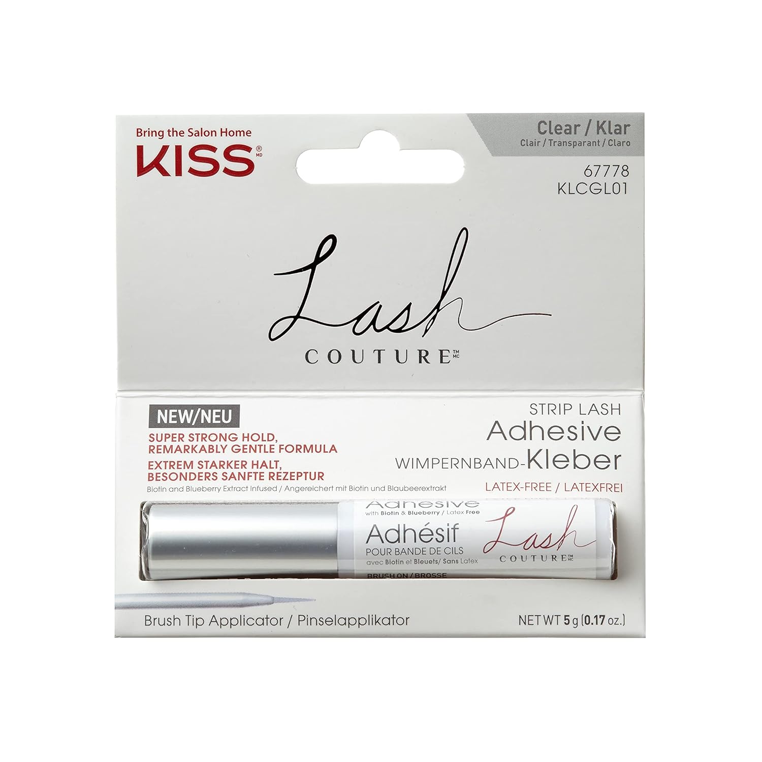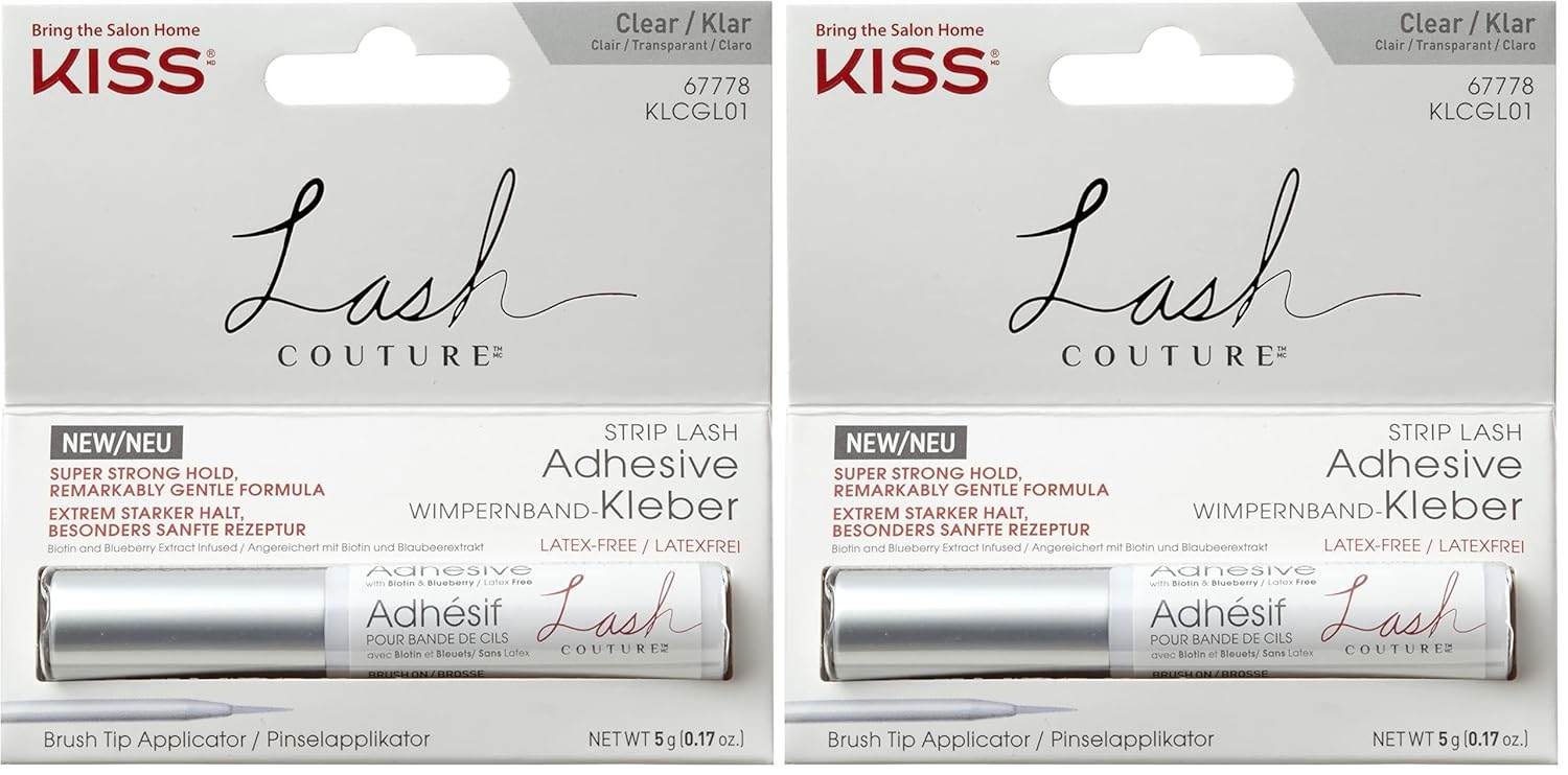 Get a life-proof lash look with KISS Lash Couture Strip Lash Adhesive. Compatible with all KISS Lash Couture and other strip lashes, this remarkably gentle formula is infused with soothing biotin & blueberry extract. Super-strong hold lash glue features a convenient brush tip applicator, making it mess-free and easy to apply. Dermatologist tested and latex-free, this lash glue is Cruelty Free, contact lens friendly, and available in clear and black formulas.