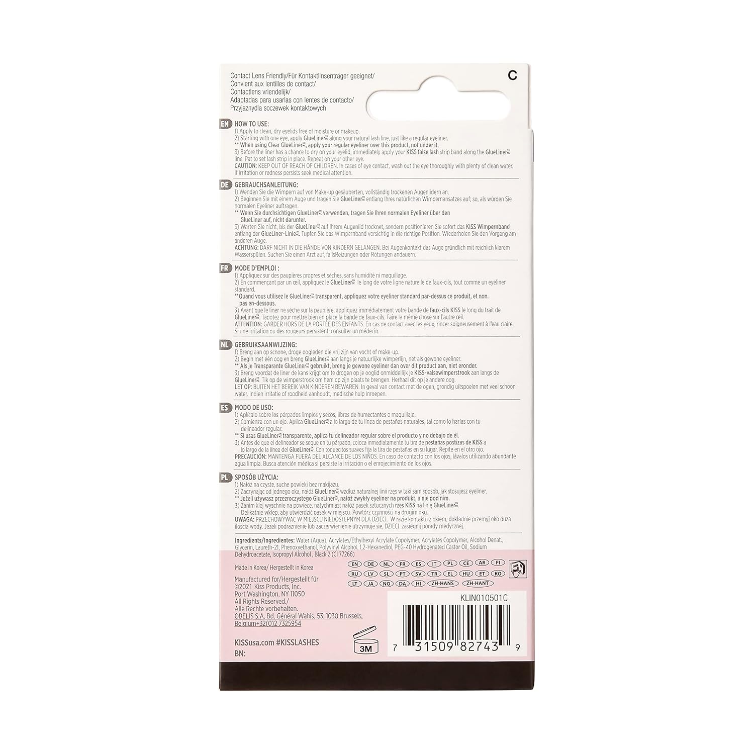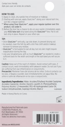 All that was tricky about gluing on false eyelashes is a thing of the past! Kiss Lash GLUEliner makes false eyelash application absolutely foolproof! No more messy eyelash adhesives to deal with - applies like eyeliner, dries like glue. This lash glue glides flawlessly along your lash line using the fine point felt tip applicator, ready for your favorite falsies to adhere to in a seamless way. As easy as 1-2-3, simply line your lid generously with as much GLUEliner as needed.