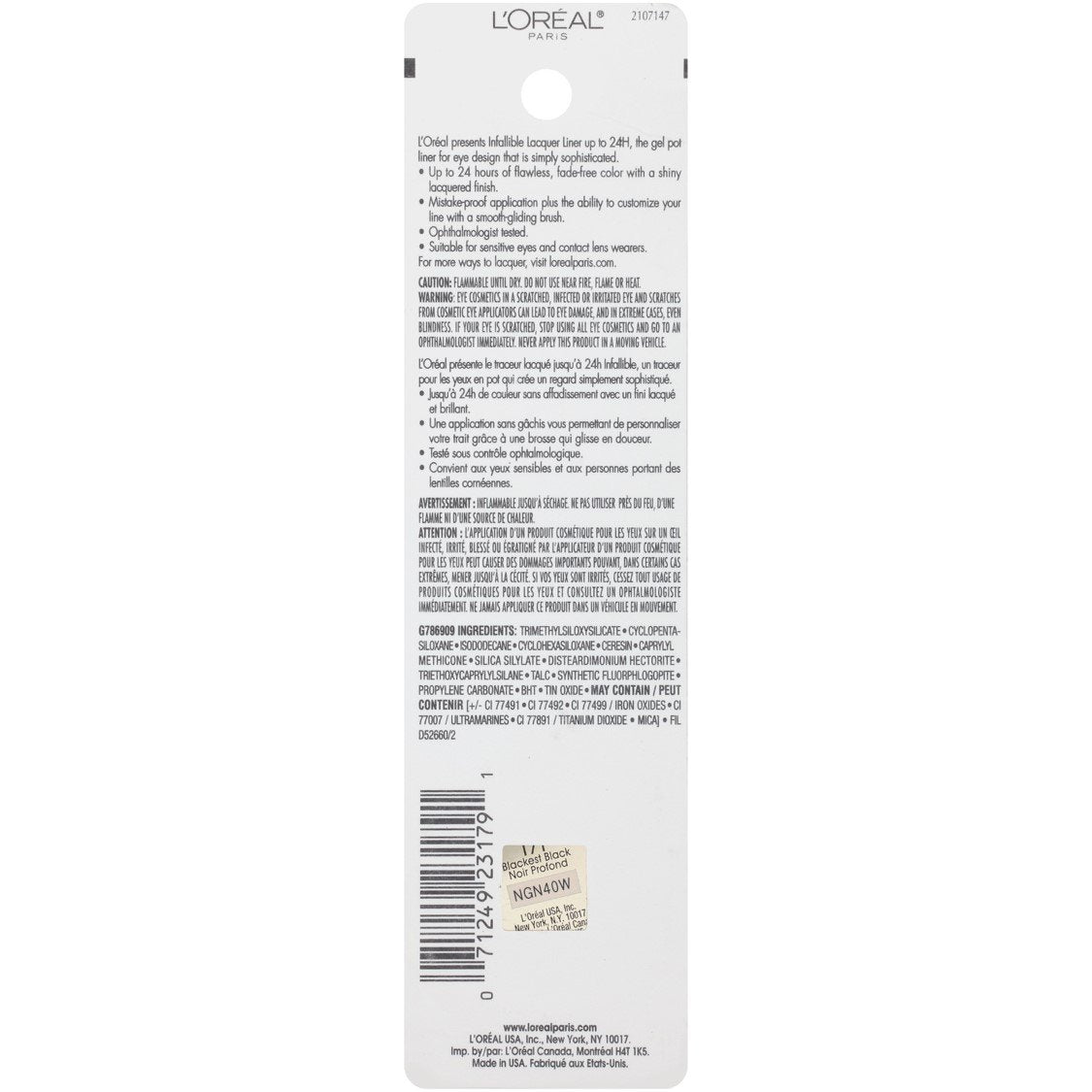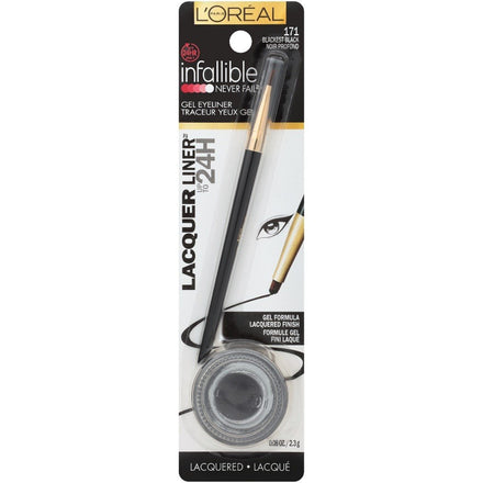 Product Description Longwear Infallible Gel Lacquer Liner 24HR glides on smoothly for precise lines and designs. Create sophisticated and long lasting eye looks with smooth gliding brush and gel pot liner. This gel formula keeps a unique lacquer finish that will last all day and night. • High-shine lacquer shine finish • Gel formula for smooth application • 24HR long wear • Flawless, fade-free wear Apply along lash line starting from inner corner of eye working outwards. Eye cosmetics in a scratched, infected or irritated eye and scratches from cosmetic eye applicators can lead to eye damage, and in extreme cases, even blindness. If your eye is scratched, stop using all eye cosmetics and go to an ophthalmologist immediately. Never apply this product in a moving vehicle. Brand Story By L'Oreal Paris