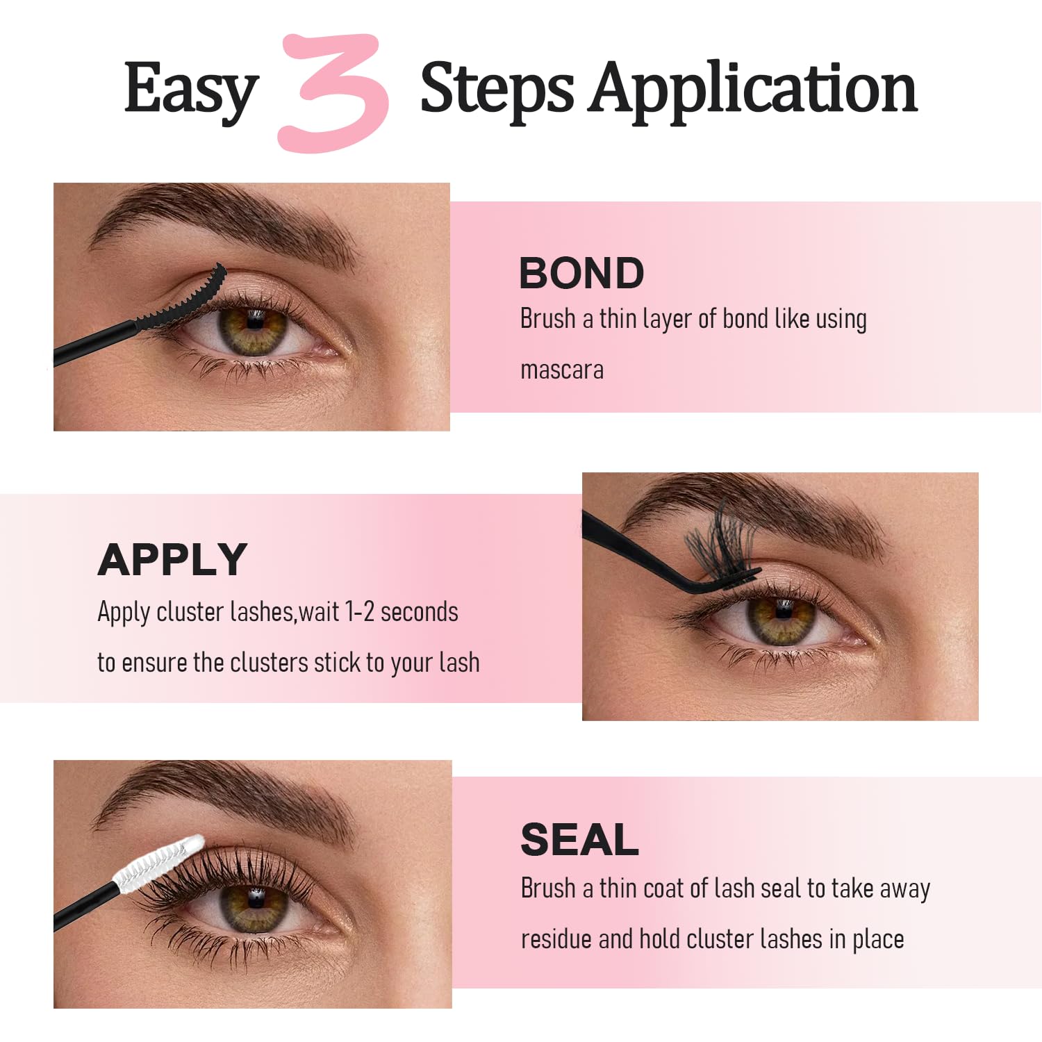 • 【How To Use】Remove excess BOND glue from the wand and apply to lashes like mascara.Gently pick up a strand of cluster lashes and place it under your natural lashes. Once all lash clusters are applied, lightly brush the LOCK sealant over the lash base to secure.