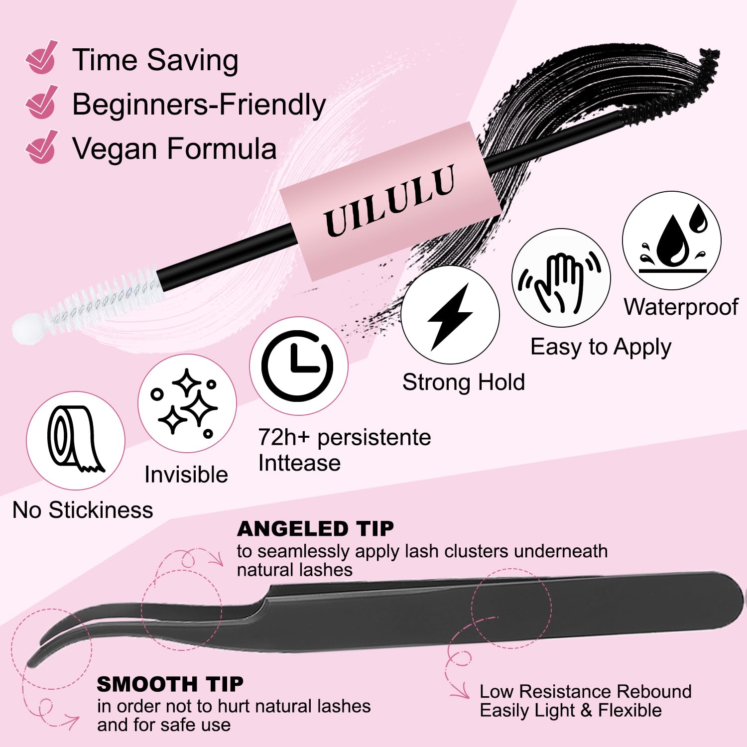 - DlY Lash Clusters Kit for At-Home Extensions - Uilulu lash clusters kit includes lash clusters, lash bond & seal, remover and tweezers. Designed withb everything for easy application at home, create salon-like eyelash extensions without appointments. Suitable for beginners and professionals