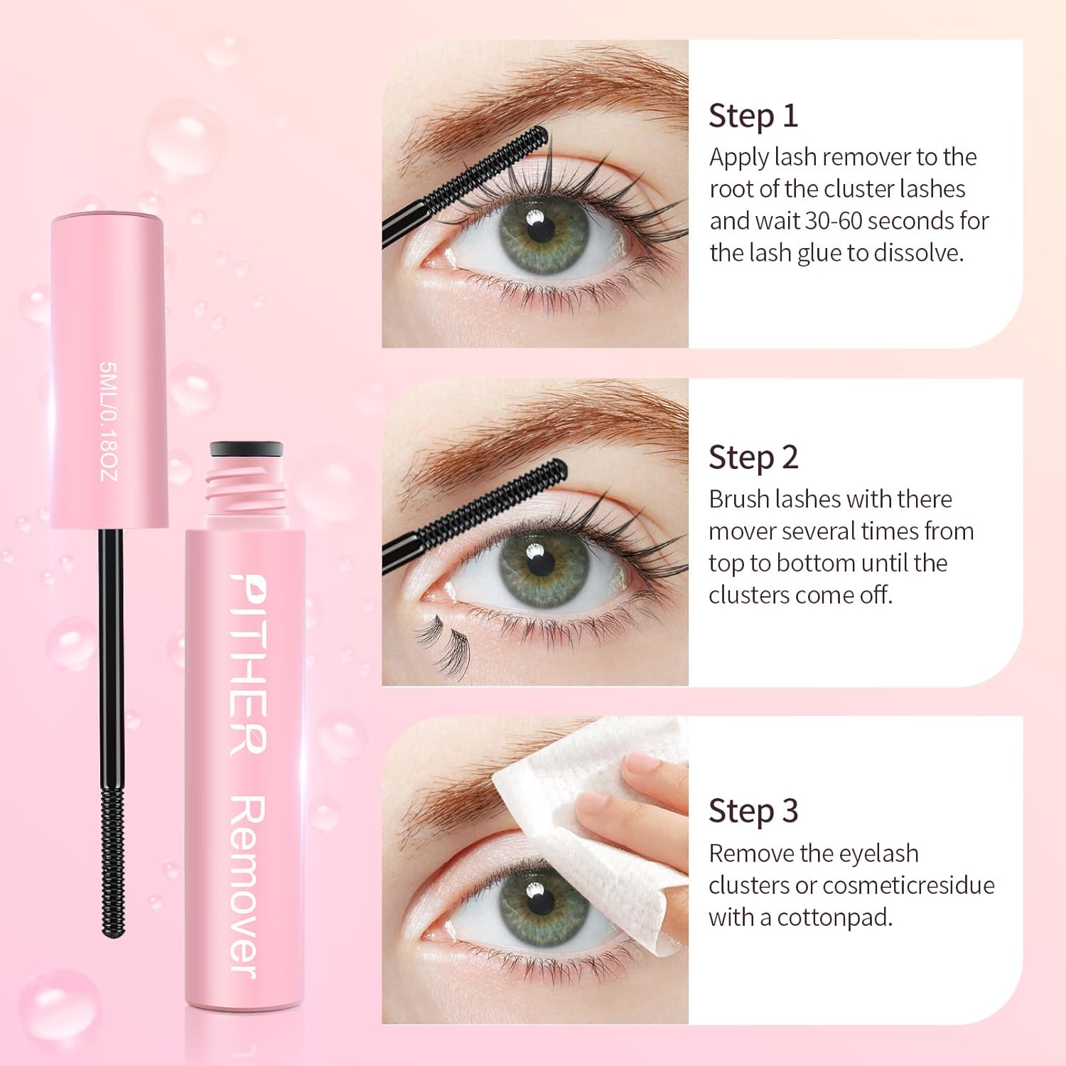 • Usage Steps: Apply eyelash remover to the root of the cluster lashes and wait 30-60 seconds for the lash glue to dissolve. Brush the eyelash brush from top to bottom several times until the eyelash clusters fall off. Use a cotton pad to gently wipe away lash clumps or makeup residue.