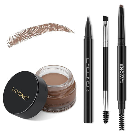 LAVONE Make up Eyebrow Pomade, Eyebrow Pencil and Eyeliner Kit LAVONE brow pencil, eyeliner and brow stamp kit instantly outlines, defines & fills in your brows no matter how much (or little) eyebrow hair you have. 1 minute to create flawless, symmetrical brow! It’s long-lasting, smudge-proof, and waterproof. Your brows will stay in place all day long. What's in the kit? 1 x Eyebrow Pomade (Dark Brown) 1 x Liquid Eyeliner (Black) 1 x Brow Pencil (Dark Brown) 1 x Dual-ended Eyebrow Brush