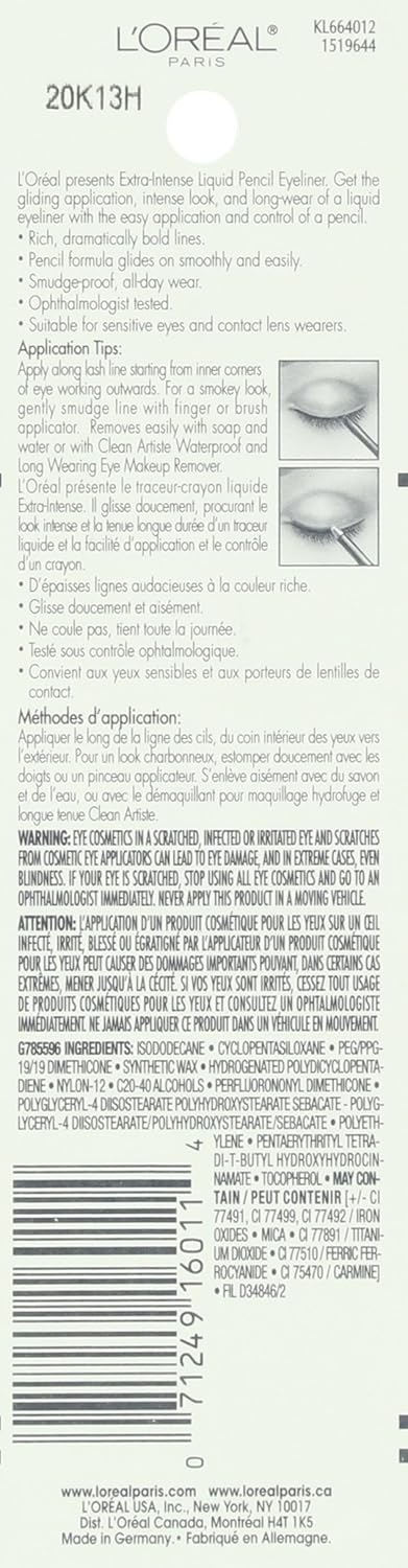 L’Oral Paris presents Extra-Intense Liquid Pencil Eyeliner. Get the intense look and gliding application of a liquid liner with the easy application and precision of a pencil. This formula glides on smoothly and easily for rich, dramatically bold lines. *Smudge-proof, all-day wear. • Liquid Glide, Pencil Precision • All day wear • Smudger included • Smudge-resistant Application tips: apply along lash line starting from inner corners of eye working outwards. For a smokey look, gently smudge line with finger of brush applicator. Removes easily with soap and water or with clean artiste waterproof and water or with clean artiste waterproof and long wearing eye makeup remover. Eye cosmetics in a scratched, infected or irritated eye and scratches from cosmetic eye applicators can lead to eye damage, and in extreme cases, even blindness. If your eye is scratched, stop using all eye cosmetics and go to an ophthalmologist immediately. Never apply this product in a moving vehicle.