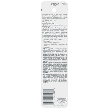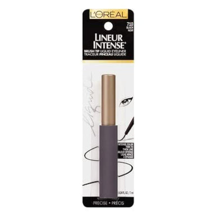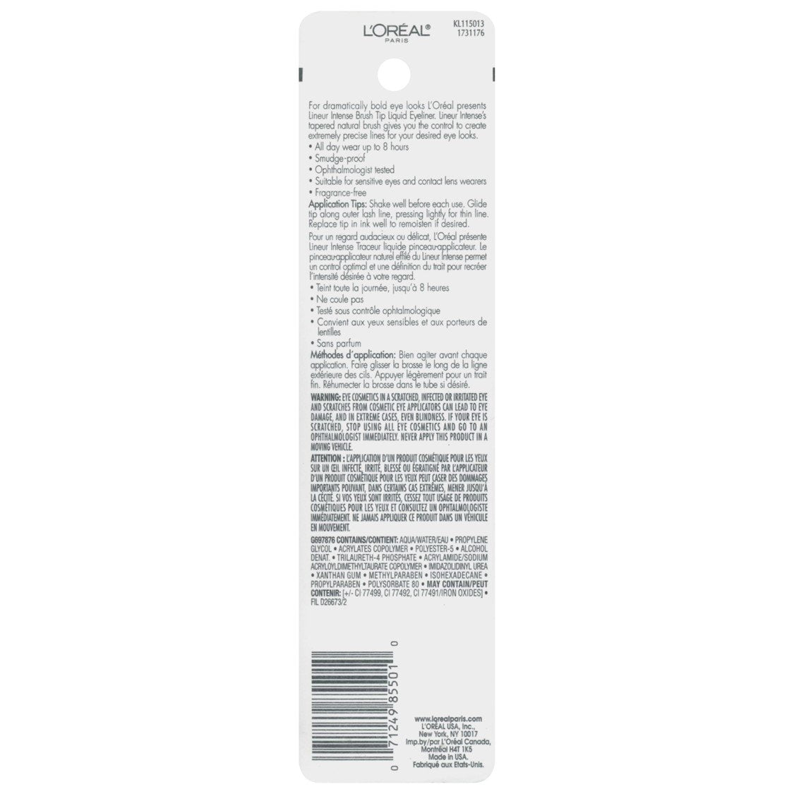 L’Oral Paris presents Lineur Intense Brush Tip Liquid Eyeliner for extreme precision. The tapered natural brush allows you to create the precise eye makeup looks from thin to thick. This L’Oral eyeliner has Intense color payoff for dramatically bold eye looks. • Long lasting eyeliner • Precision eyeliner • Smudge-Proof • Will not fade away Shake well before each use. Glide tip along outer lash line, pressing lightly for a thin line. Eye cosmetics in a scratched, infected or irritated eye and scratches from cosmetic eye applicators can lead to eye damage, and in extreme cases, even blindness. If your eye is scratched, stop using all eye cosmetics and go to an ophthalmologist immediately. Never apply this product in a moving vehicle.