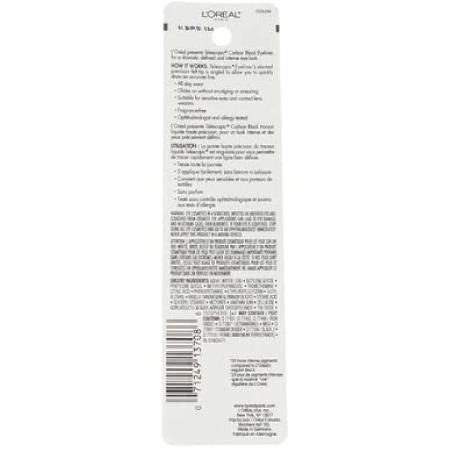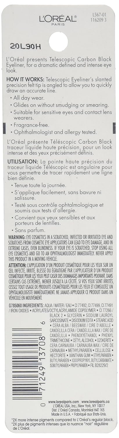 • L'Oreal Liquid Eyeliner: The Telescopic Precision Liquid Eyeliner, with slanted felt tip, is angled to allow you to quickly draw the most accurate line and glides on without smudging or smearing; Suitable for sensitive eyes and contact lens wearers