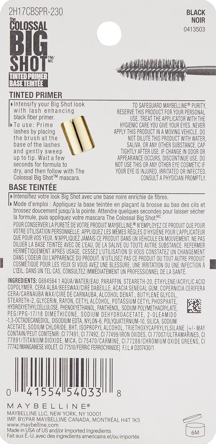 Maybelline's Tinted Primer preps eyelashes for easy mascara application. The Big Shot brush features unique, wavy bristles that cradle lashes, while the collagen formula delivers bold volume, length, and thickness for a fanned-out fringe look. Ophthalmologist tested. Suitable for contact lens wearers.