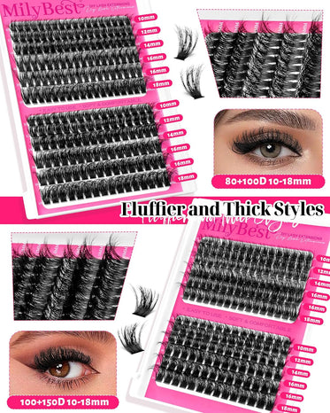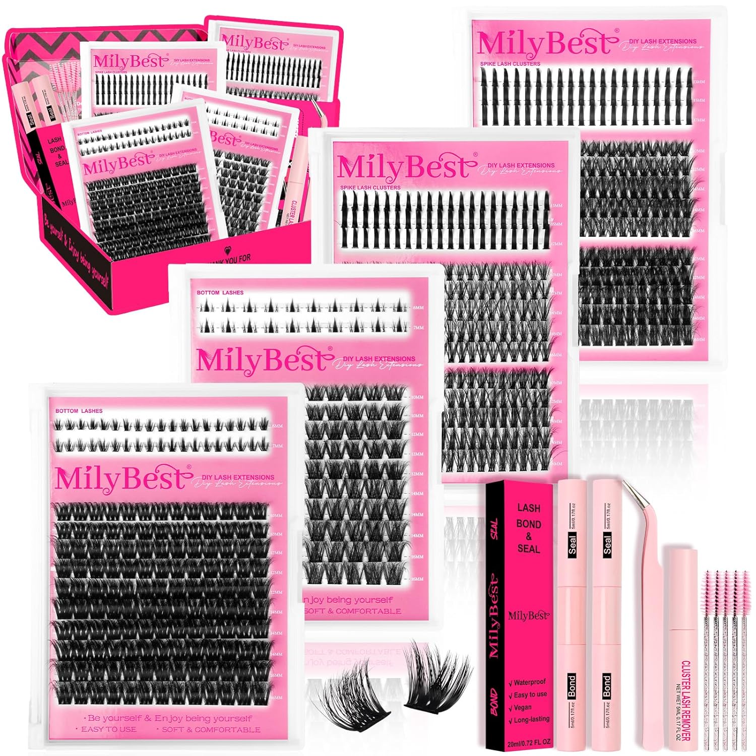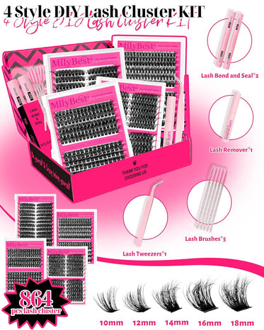 - [Complete Lash Clusters Kit at Home Salon Value]: Each MilyBest eyelash extension kit includes: 864 PCS Cluster Lashes + 2X 10ml Dual-ended Lash Glue (black bond + white seal) + 5ml Eyelash Makeup Remover + 1 Eyelash Tweezers + 5 Eyelash & Eyebrow Brushes. Get everything you need in one affordable set