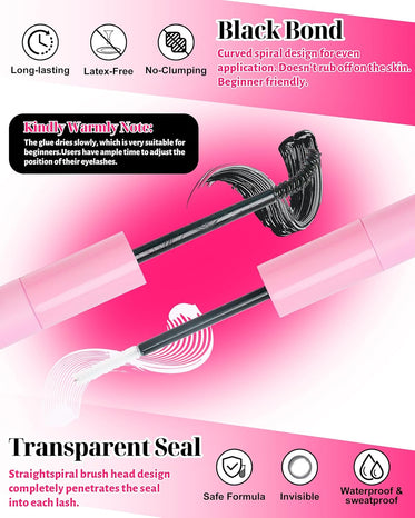 - [Professional Lash Bond and Seal and Remover]: Our specially formulated lash adhesive features waterproof black bond for strong hold and white seal for lasting protection. The included eyelash tweezers provide perfect control, making application easy for beginners and experts alike