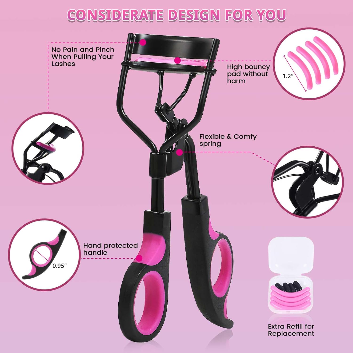 - đ ăErgonomic DesignăThis eyelash curler features a wide-angle clamp that perfectly fits the natural shape of your eyes without pinching or causing pain. The round handle with a curved extension design provides a comfortable grip and allows flexible curling motion. Suitable for various eye shapes and lash lengths, the compact size with a box easily fits in your makeup bag and travel bag.