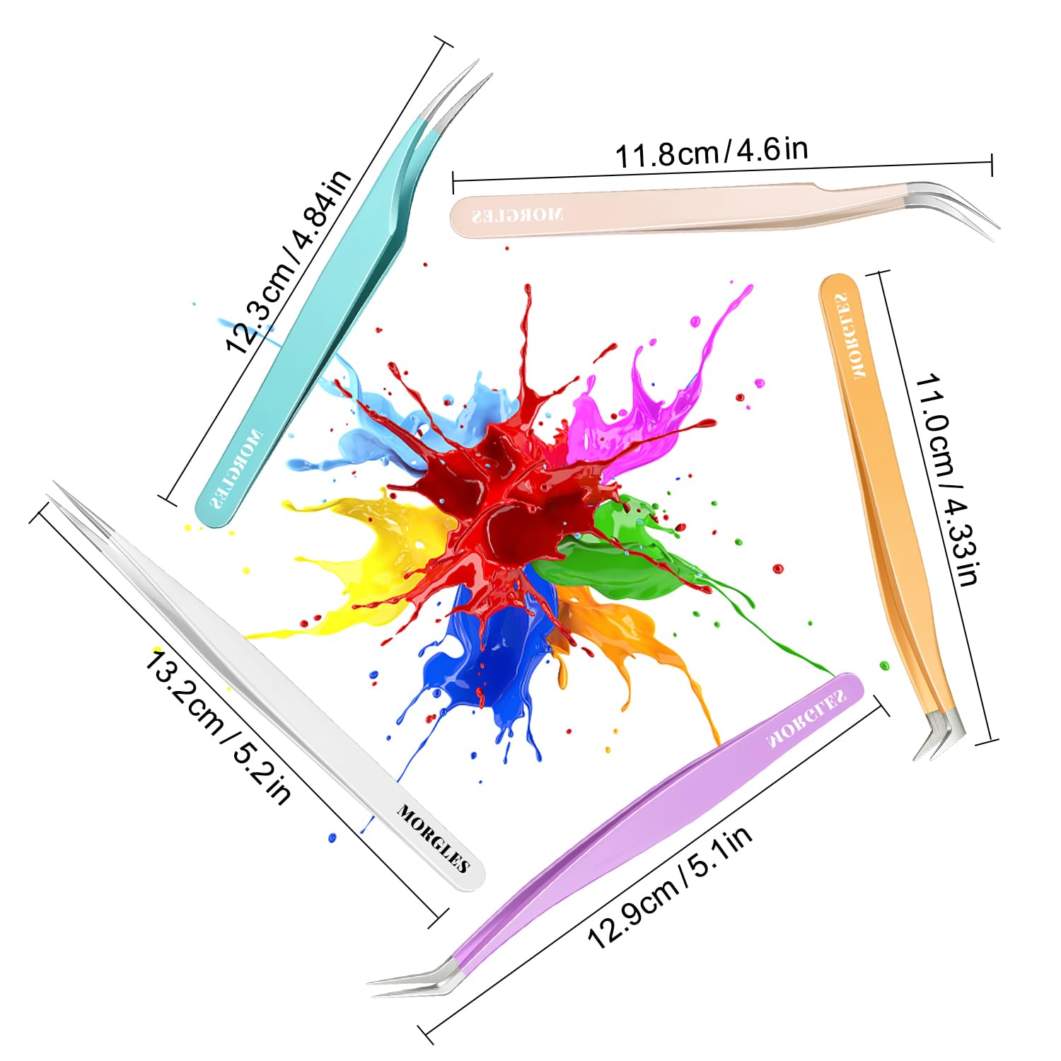 MORGLES Straight & Curved Lash Tweezers for Eyelash Extensions, 5 Pcs Precision Eyelash Tweezers for False Lashes, Lash Applicator Tool for Women Beginners